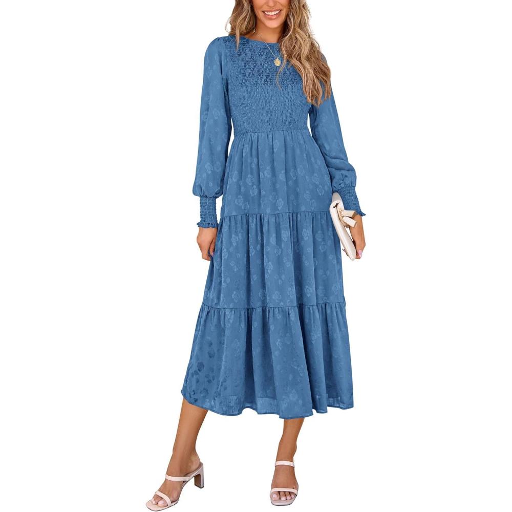 imagePRETTYGARDEN Womens Fall Spring Midi Dress Long Sleeve Floral Smocked Elegant Wedding Guest Long Flowy Dresses with PocketsBlue