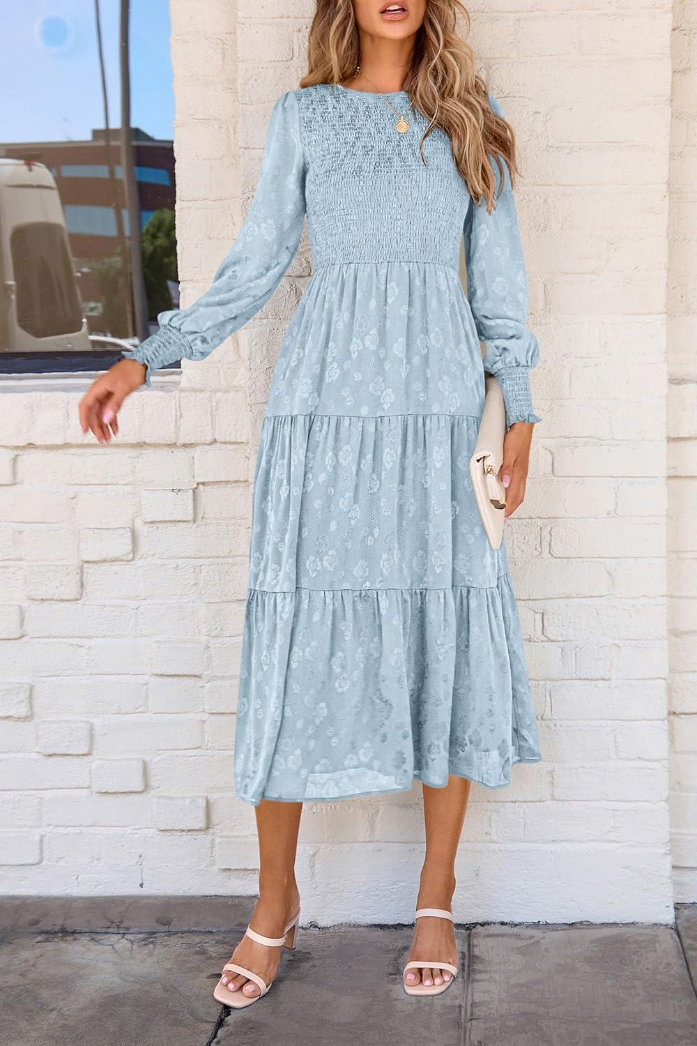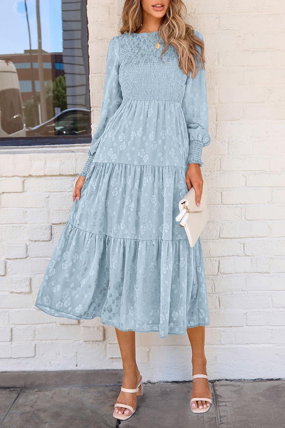 PRETTYGARDEN Women’s Fall Spring Midi Dress Long Sleeve Floral Smocked Elegant Wedding Guest Long Flowy Dresses with Pockets(Light Blue)