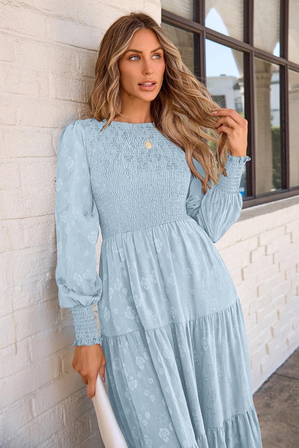 PRETTYGARDEN Women's Fall Spring Midi Dress Long Sleeve Floral Smocked Elegant Wedding Guest Long Flowy Dresses with Pockets(Light Blue)