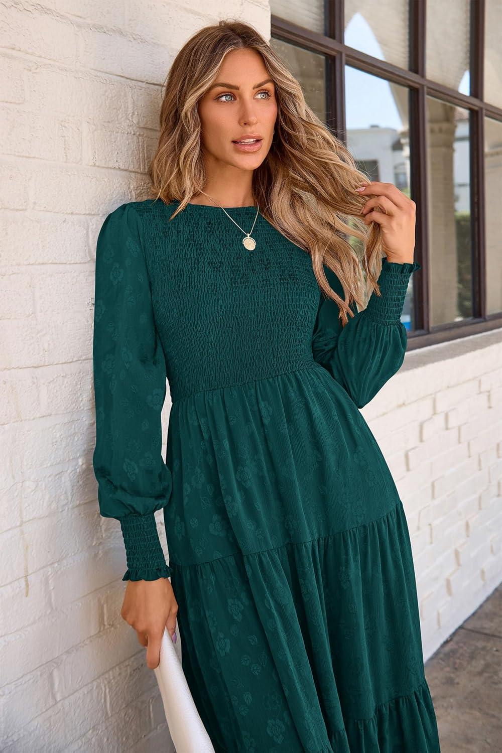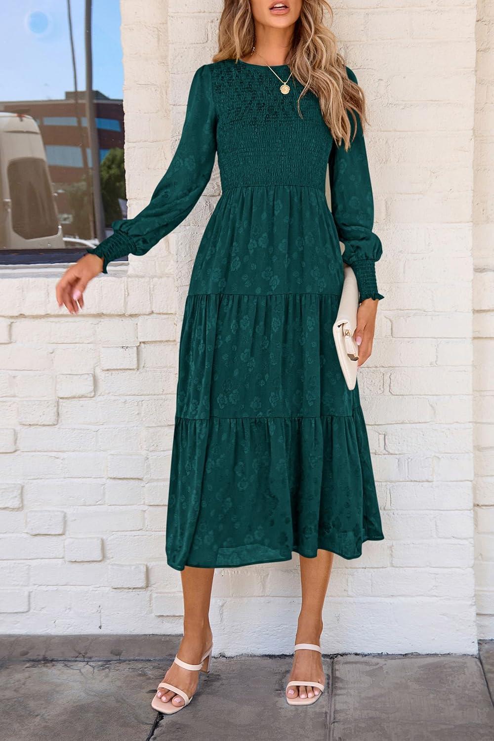 PRETTYGARDEN Women’s Fall Spring Midi Dress Long Sleeve Floral Smocked Elegant Wedding Guest Long Flowy Dresses with Pockets(Malachite Green)