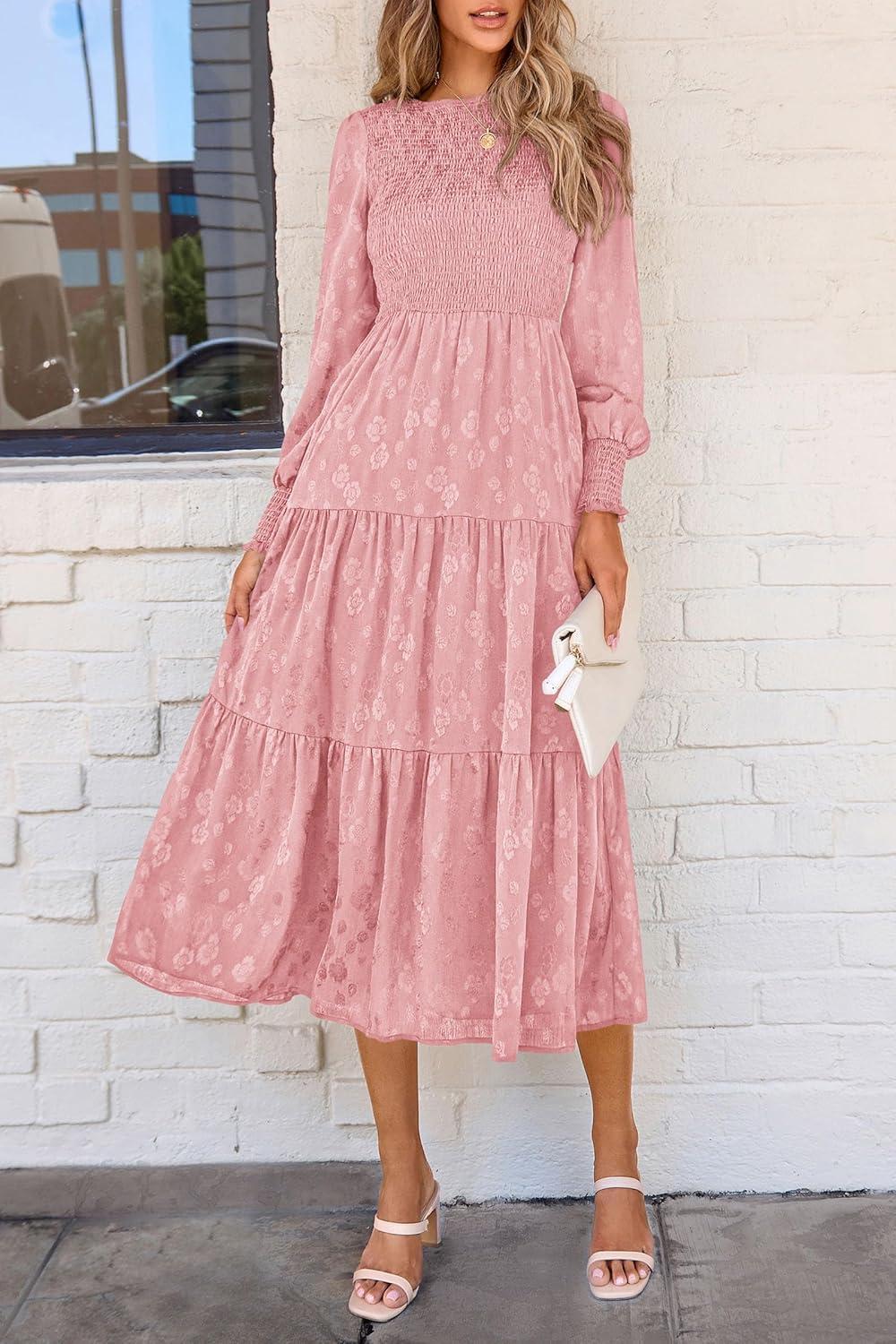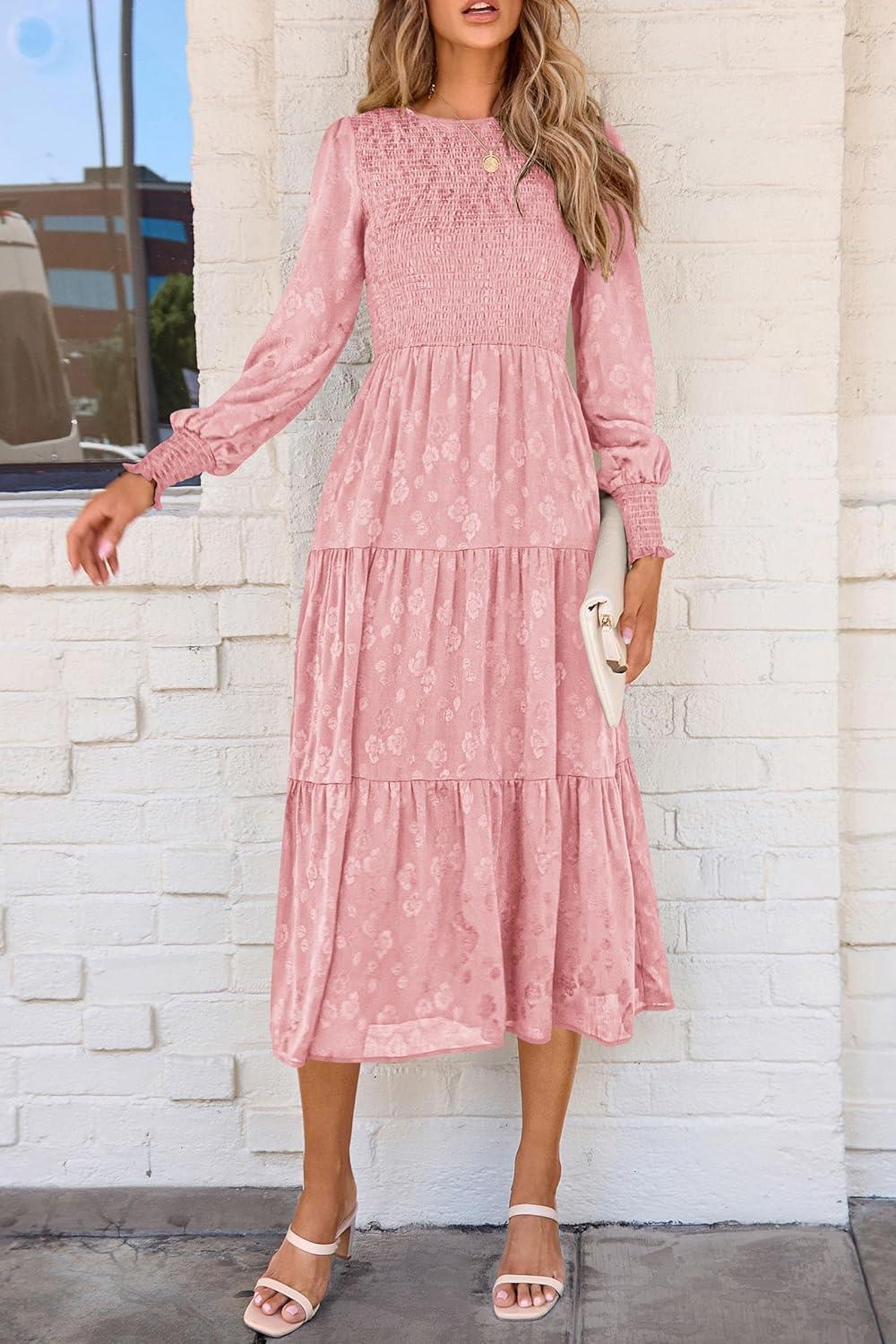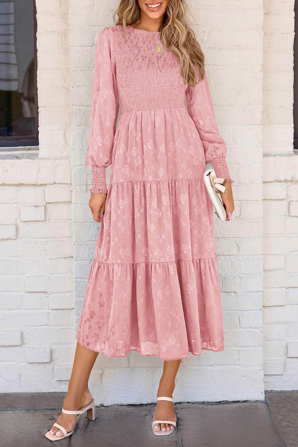 PRETTYGARDEN Women’s Fall Spring Midi Dress Long Sleeve Floral Smocked Elegant Wedding Guest Long Flowy Dresses with Pockets(Pink)