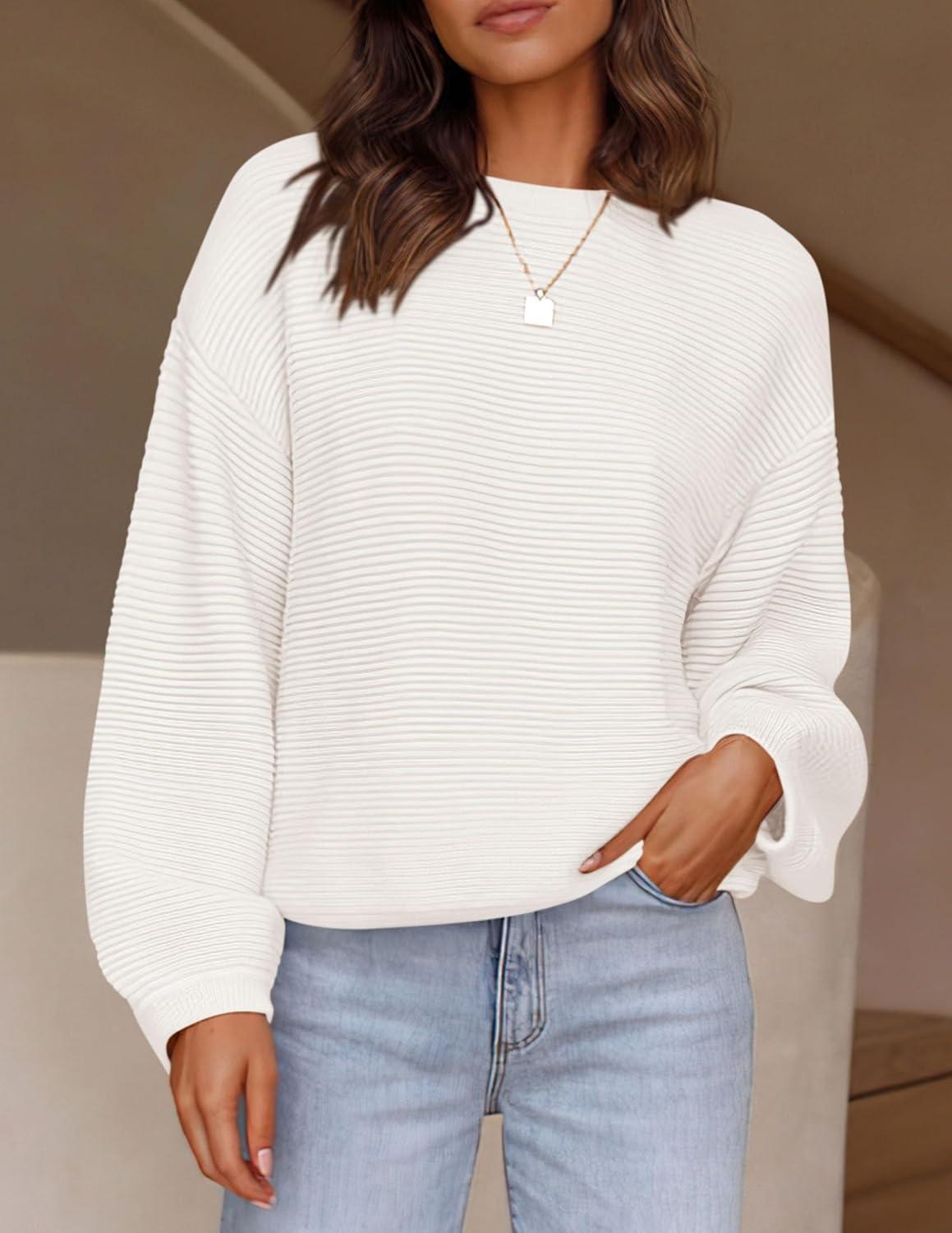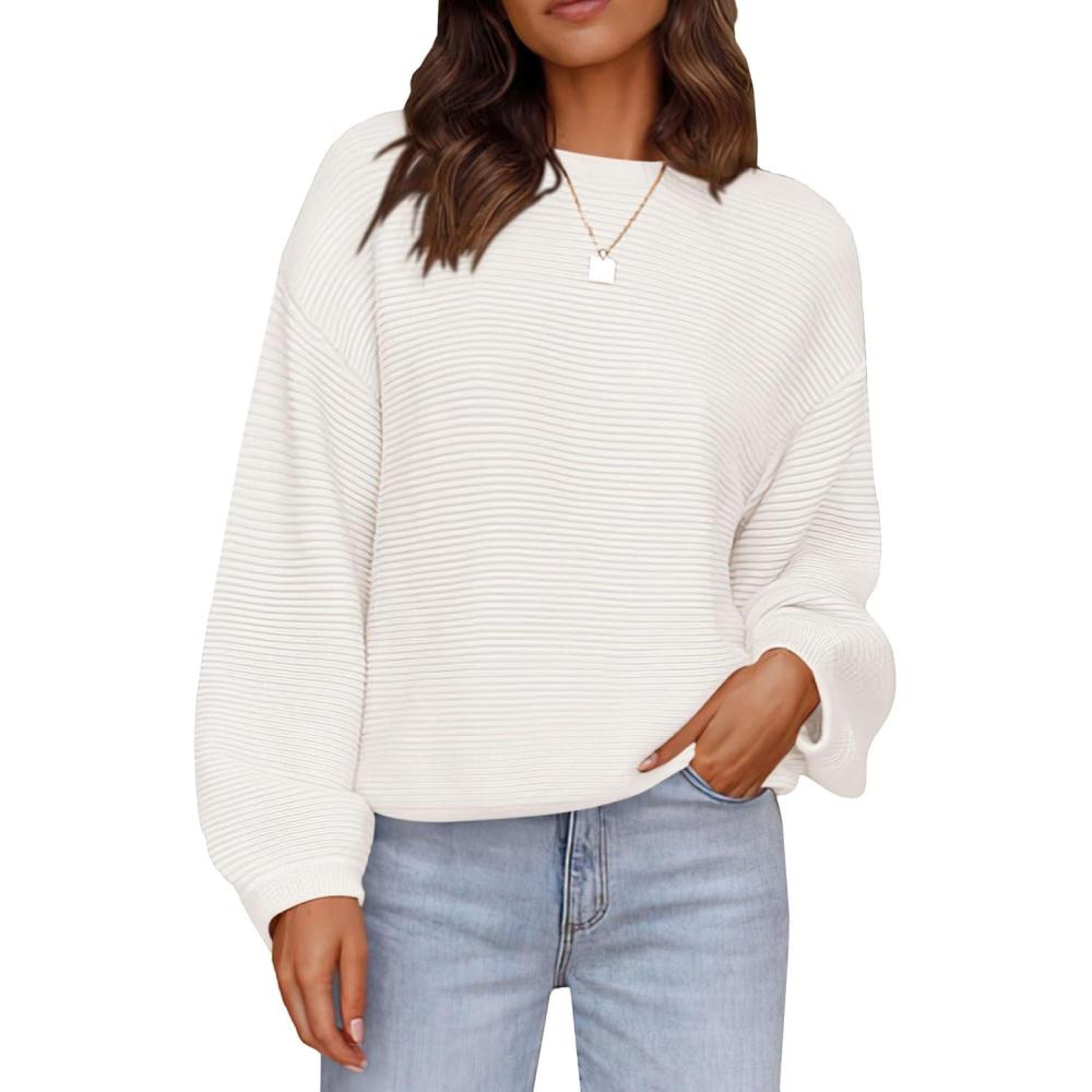 PRETTYGARDEN Womens Fall Sweaters 2025 Casual Loose Crewneck Ribbed Long Sleeve Top Knit Pullover Sweater(Beige White)