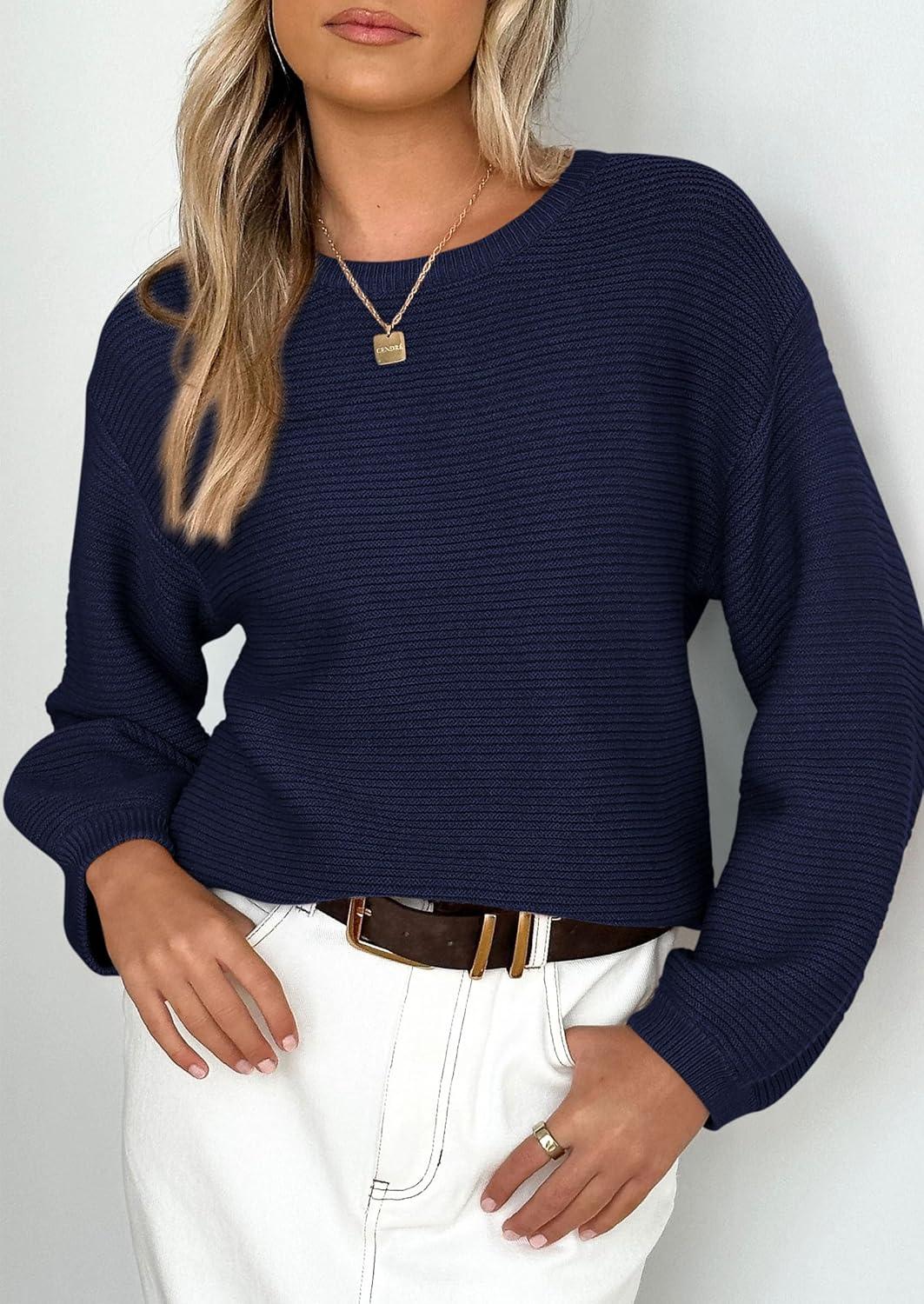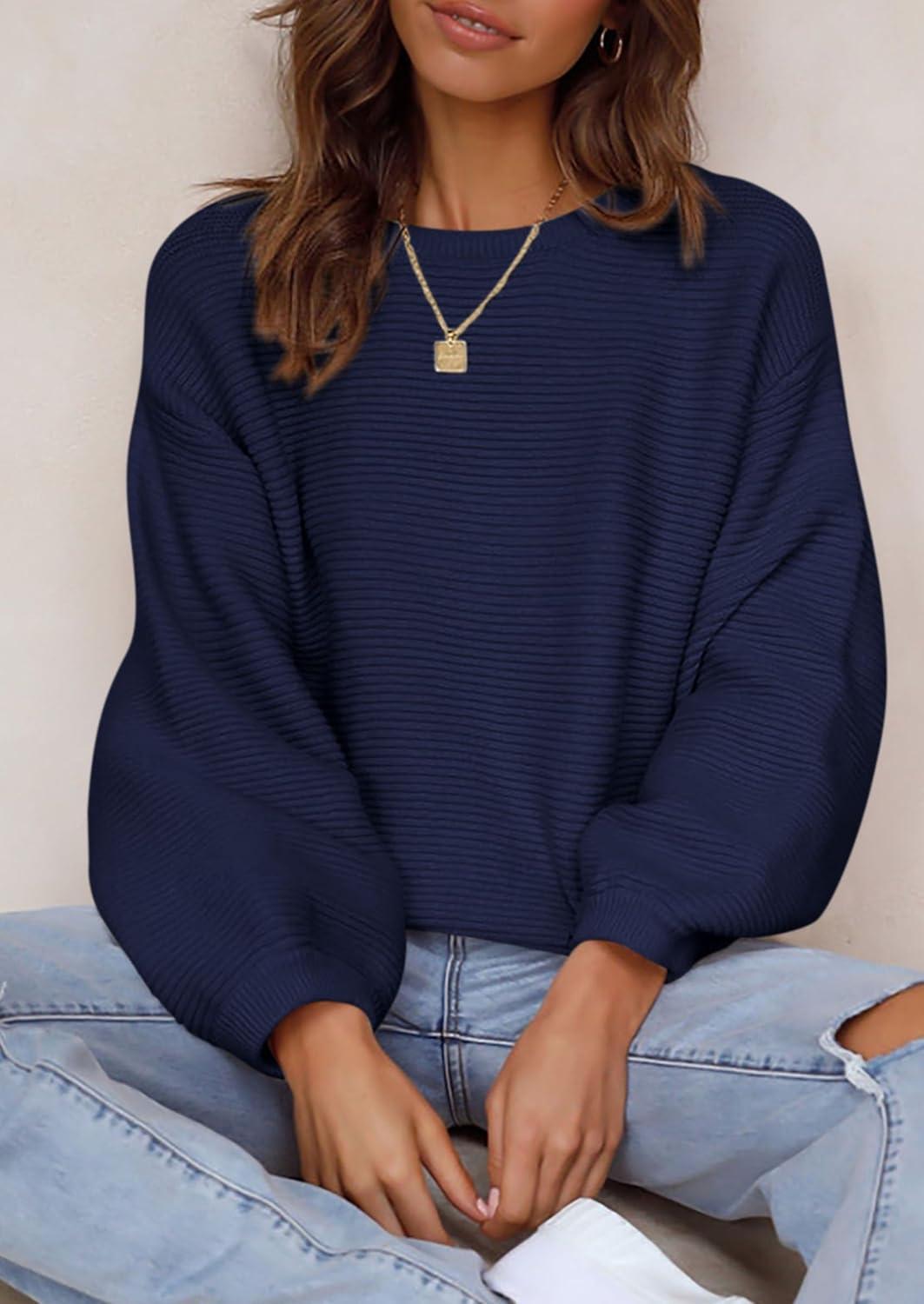 PRETTYGARDEN Womens Fall Sweaters 2025 Casual Loose Crewneck Ribbed Long Sleeve Top Knit Pullover Sweater(Dark Blue)