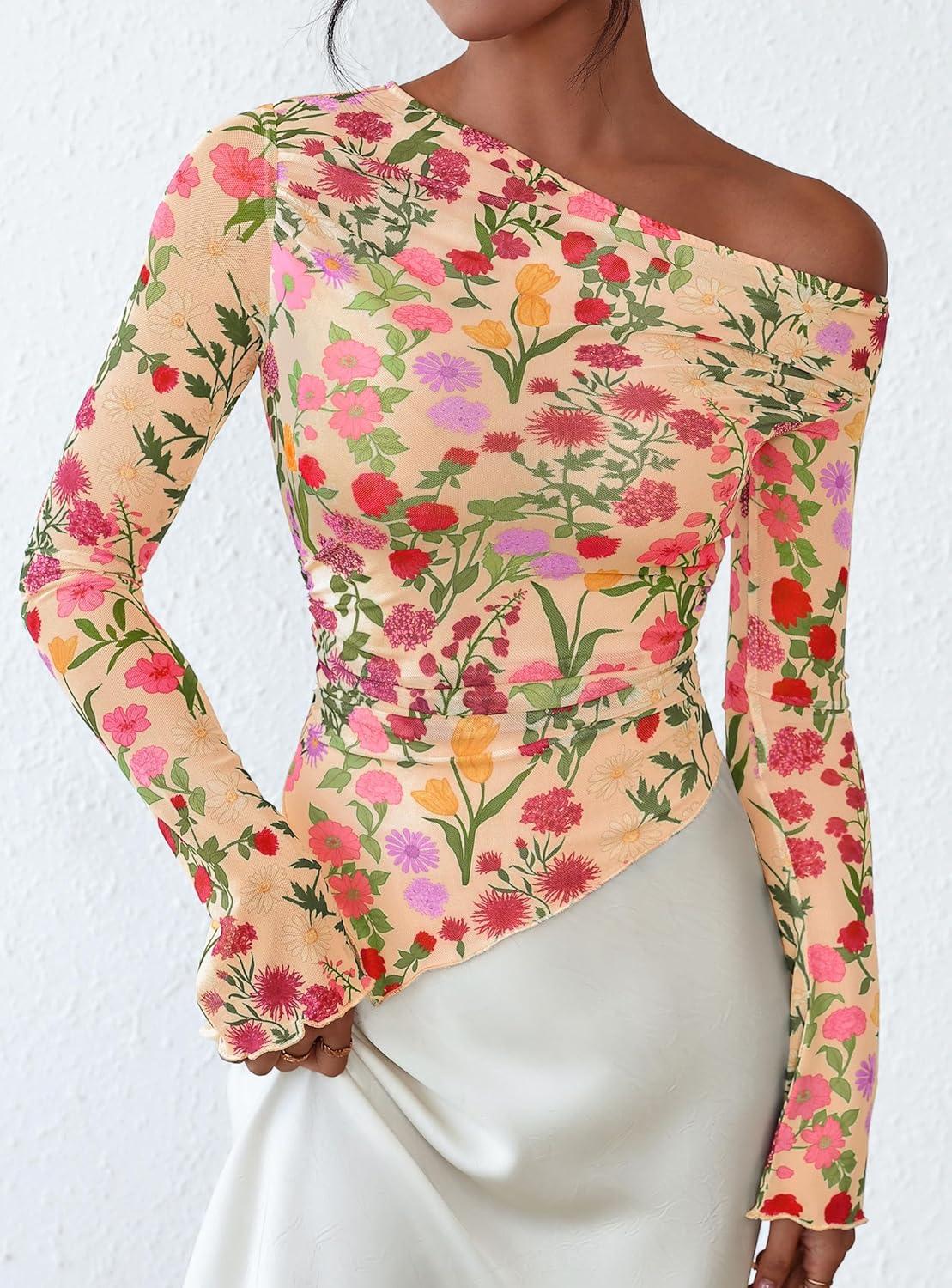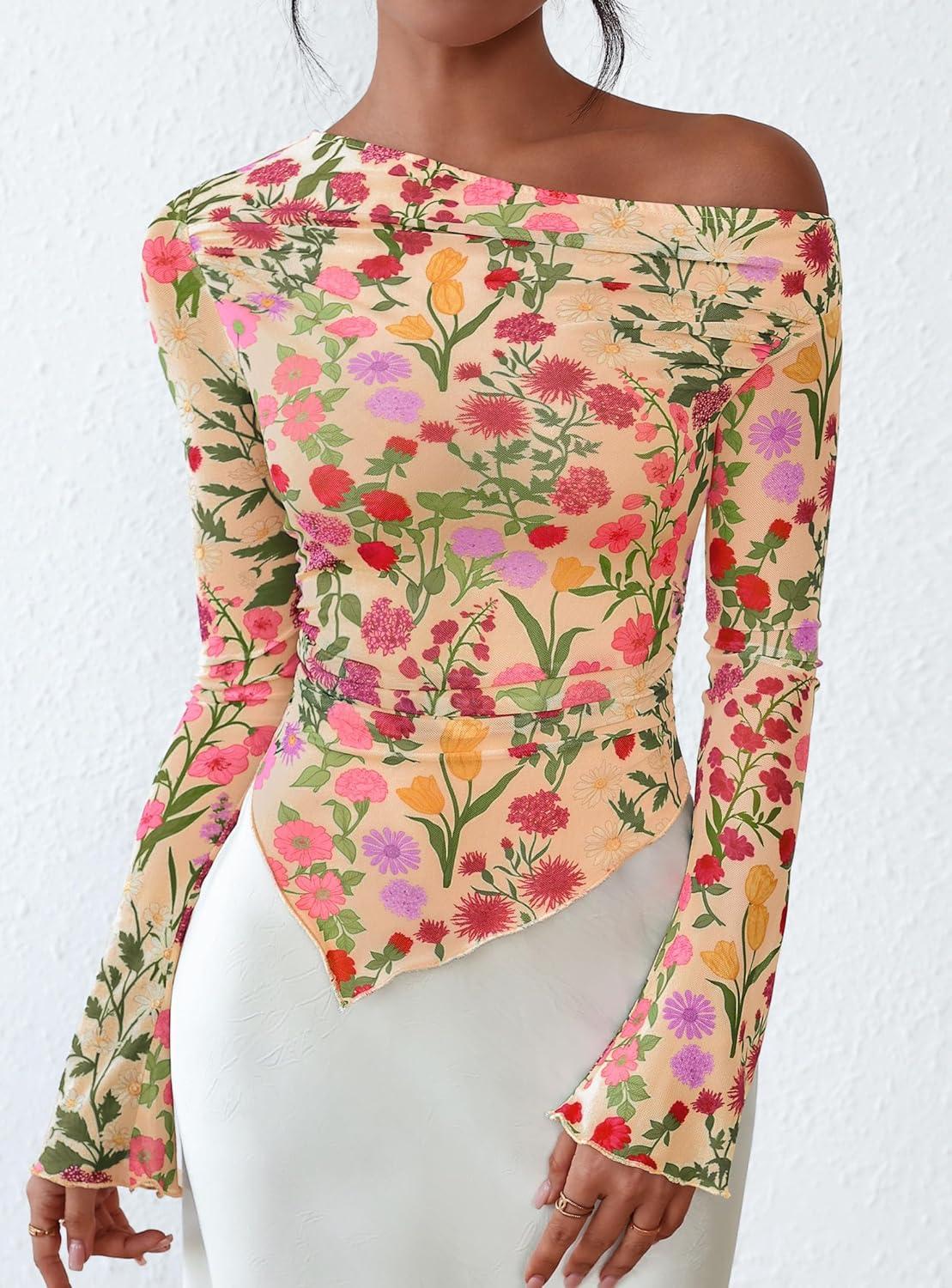 PRETTYGARDEN Womens Fall Trendy Off Shoulder Y2k Tops 2025 Tie Dye Mesh Long Sleeve Shirts Asymmetrical Ruched Floral Blouse(Floral Apricot Multi)