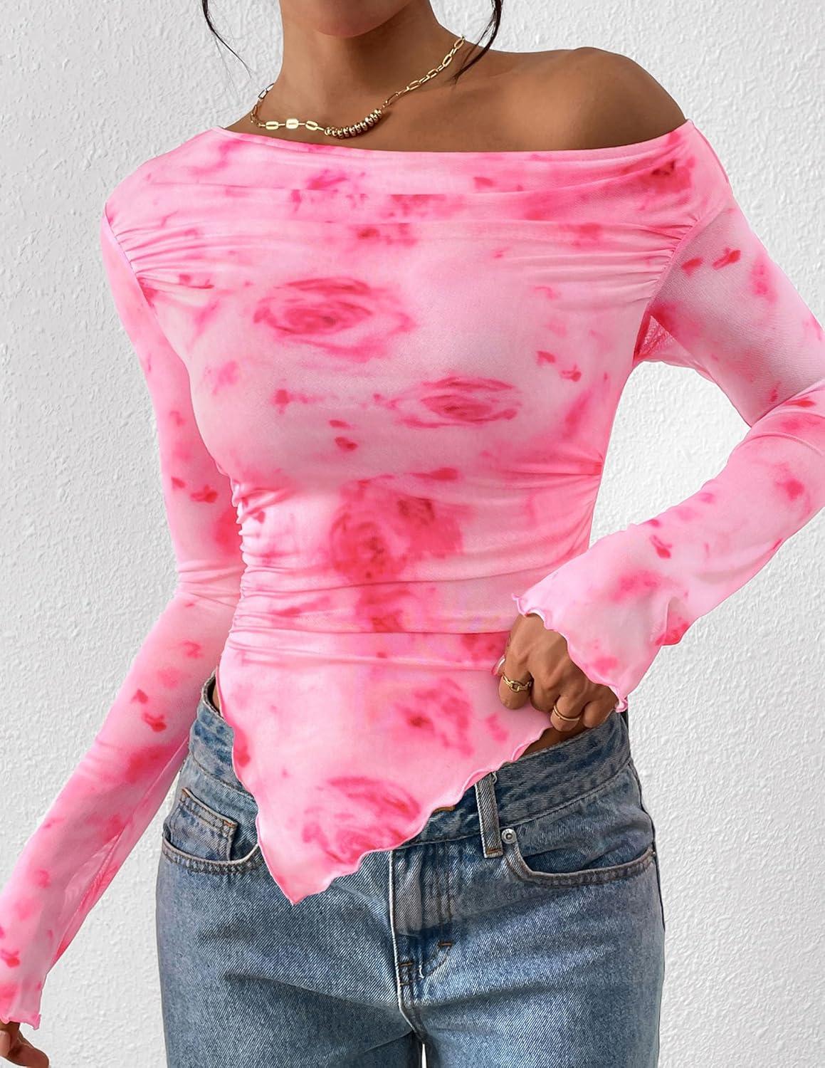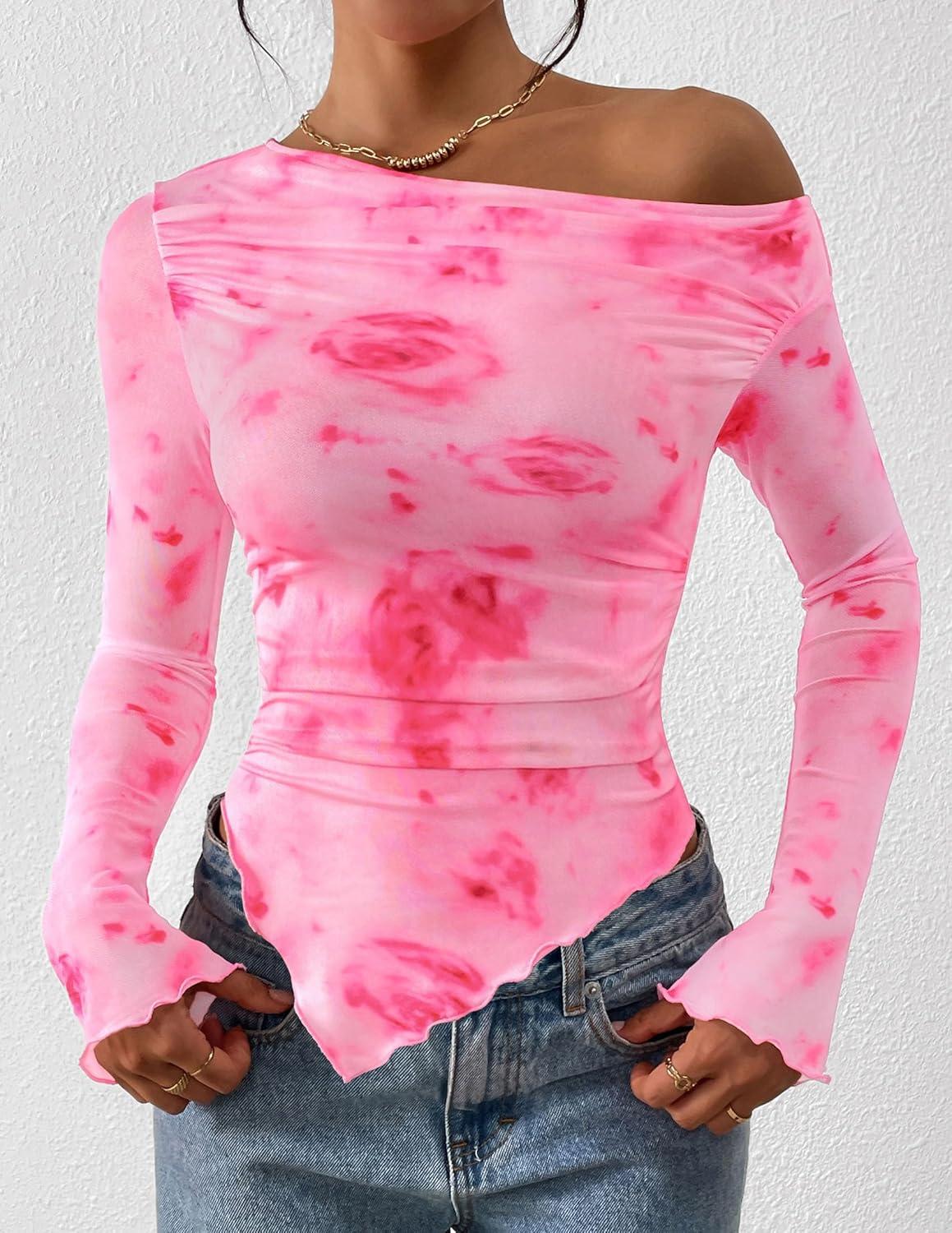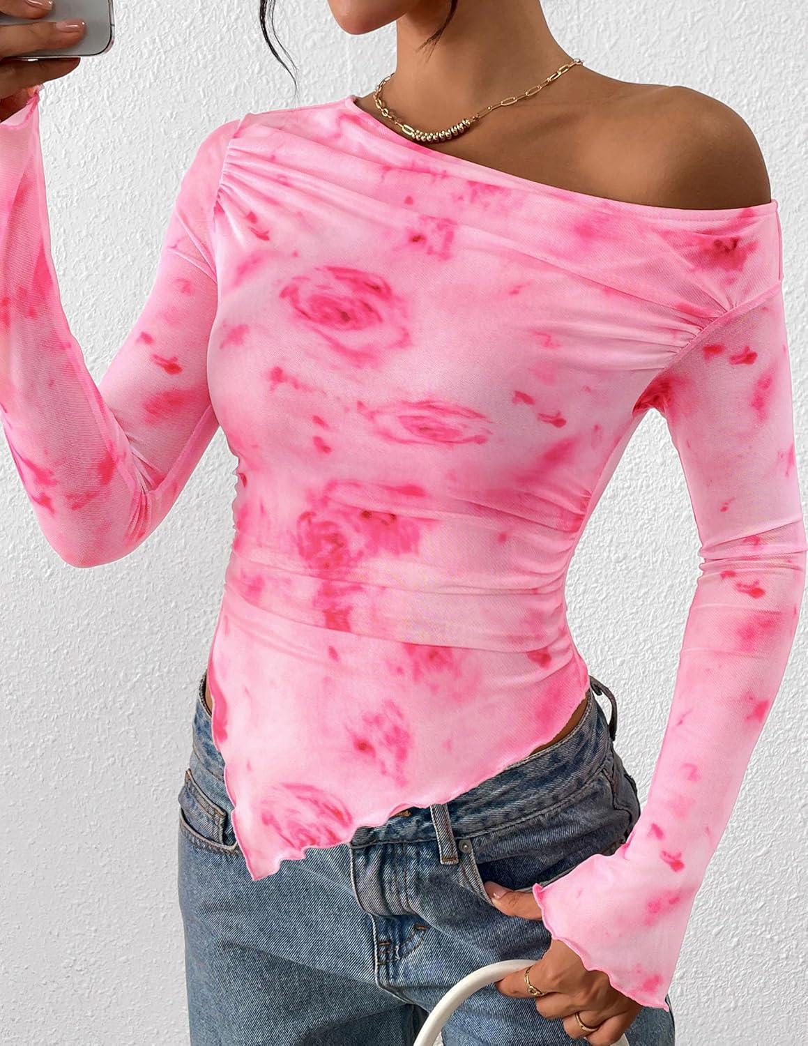 PRETTYGARDEN Womens Fall Trendy Off Shoulder Y2k Tops 2025 Tie Dye Mesh Long Sleeve Shirts Asymmetrical Ruched Floral Blouse(Floral Pink Red)