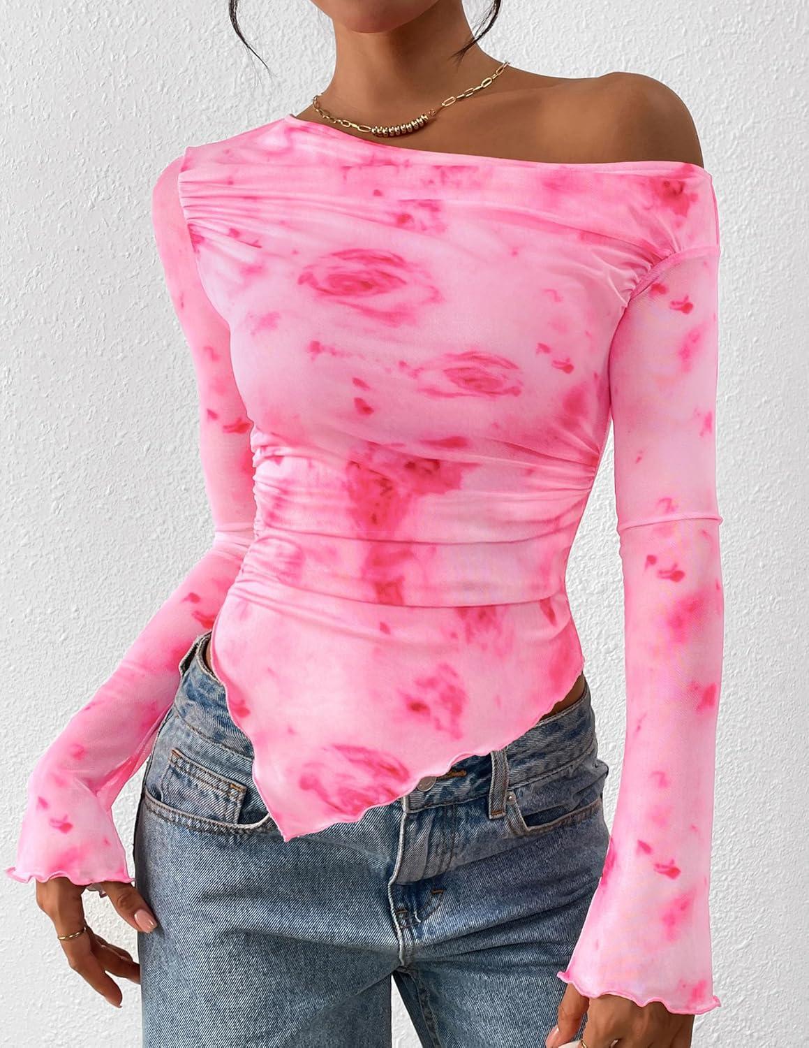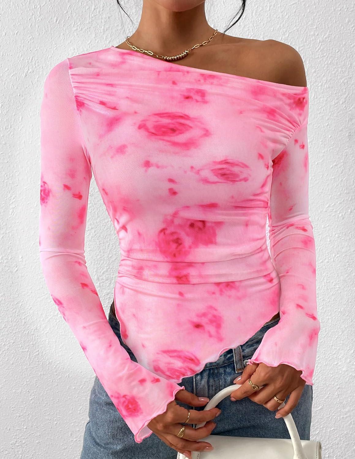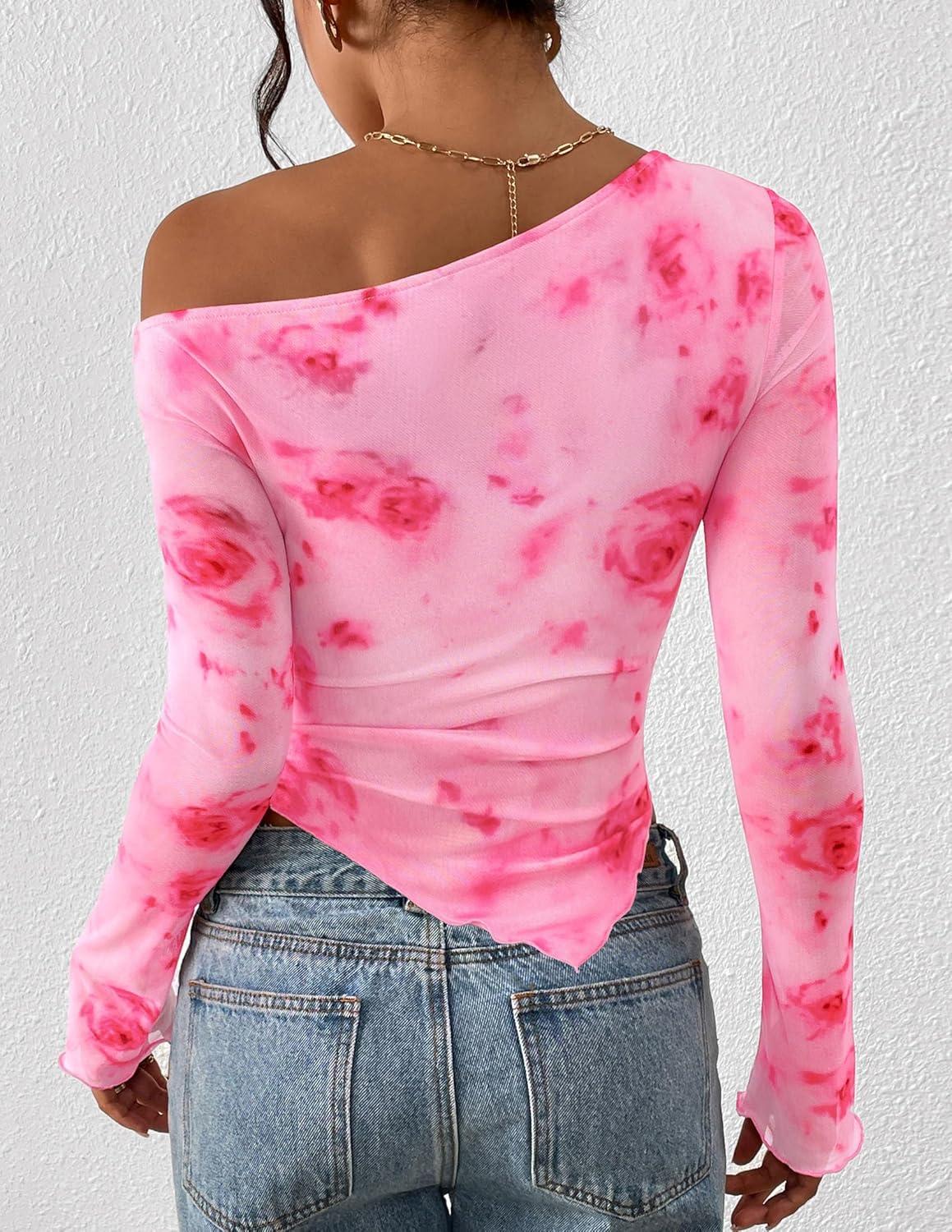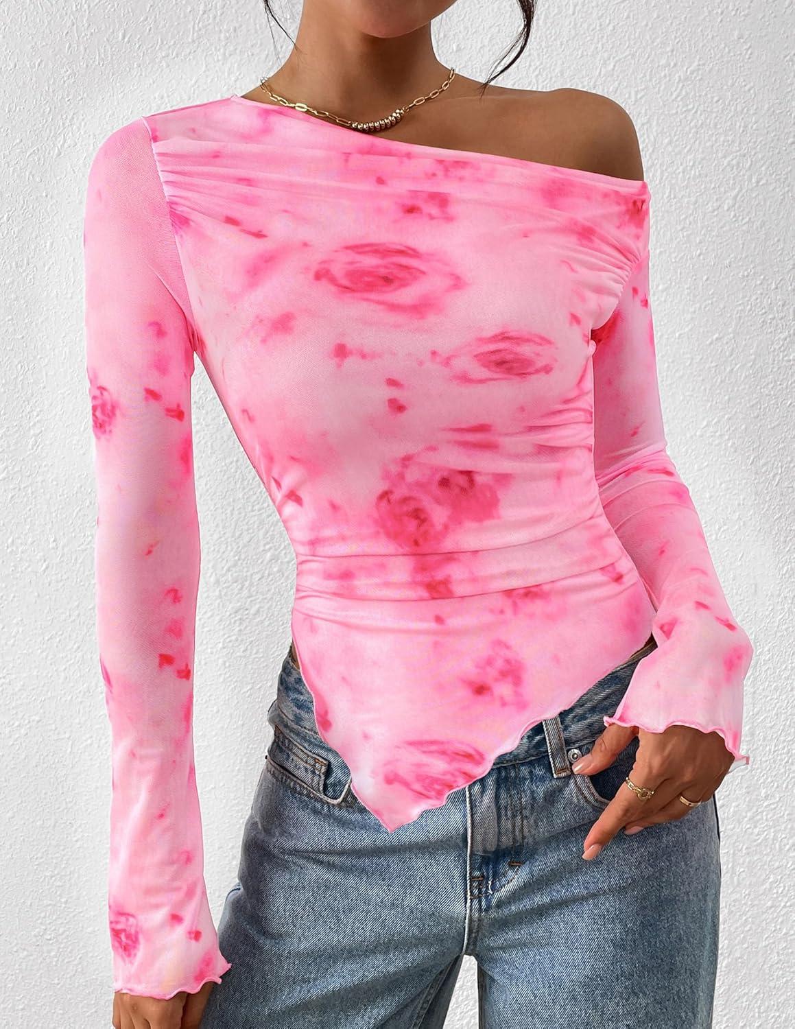 PRETTYGARDEN Womens Fall Trendy Off Shoulder Y2k Tops 2025 Tie Dye Mesh Long Sleeve Shirts Asymmetrical Ruched Floral Blouse(Floral Pink Red)
