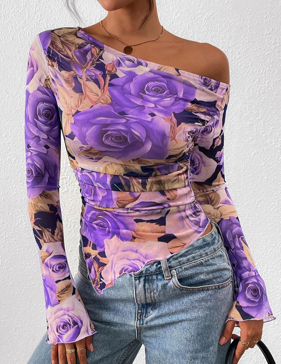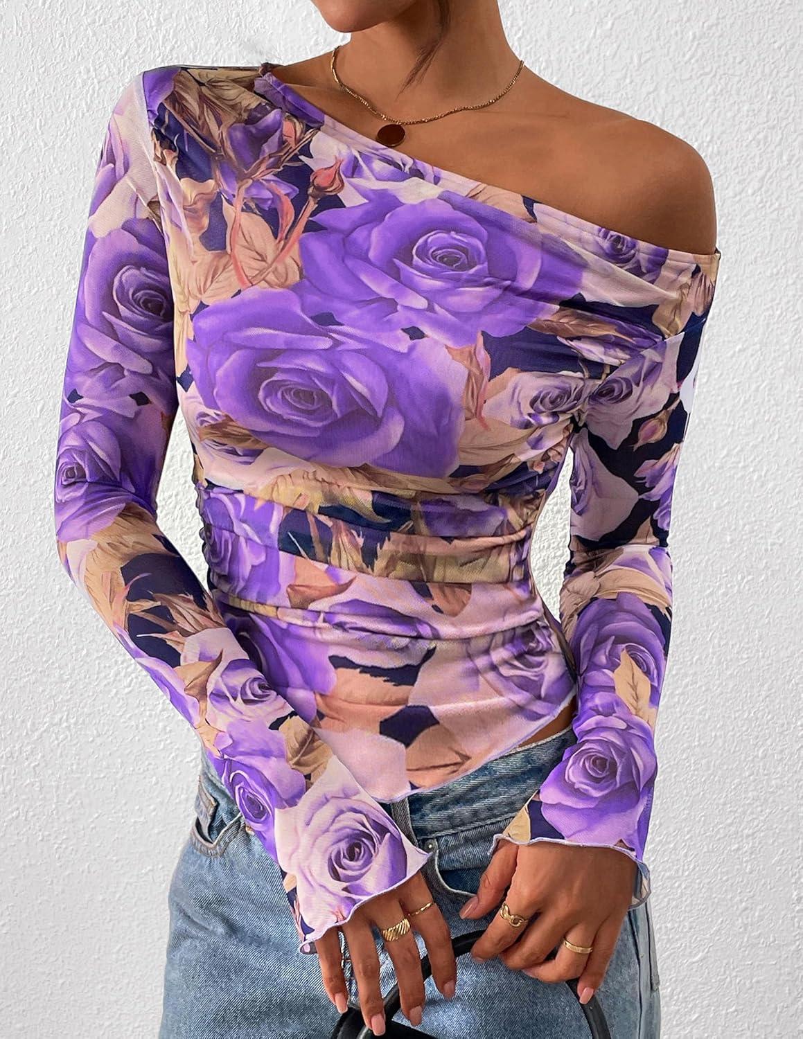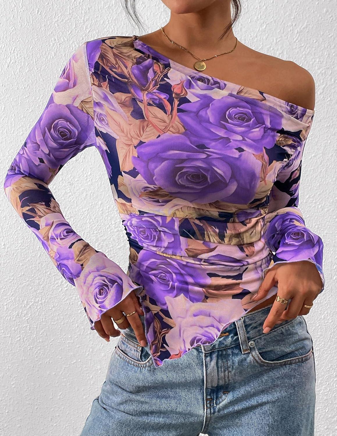PRETTYGARDEN Womens Fall Trendy Off Shoulder Y2k Tops 2025 Tie Dye Mesh Long Sleeve Shirts Asymmetrical Ruched Floral Blouse(Floral Purple)