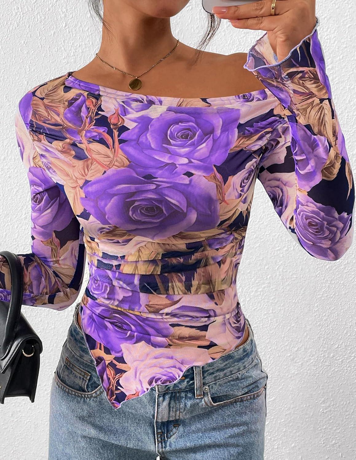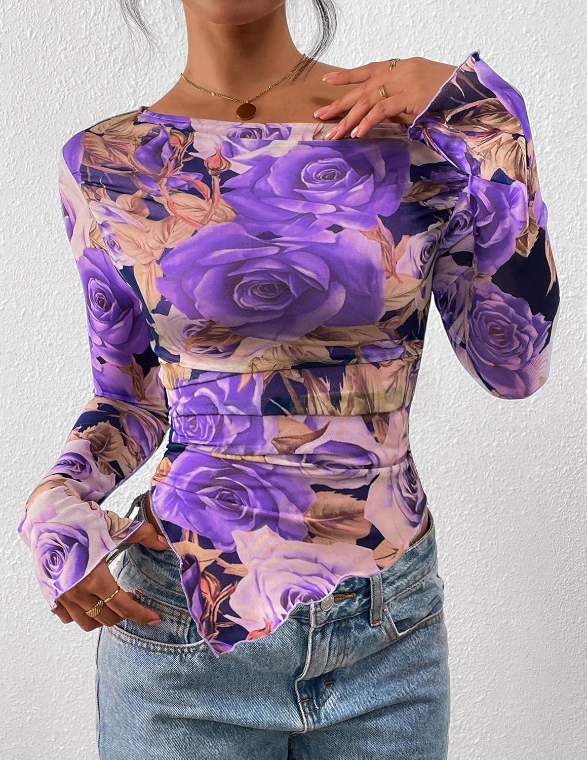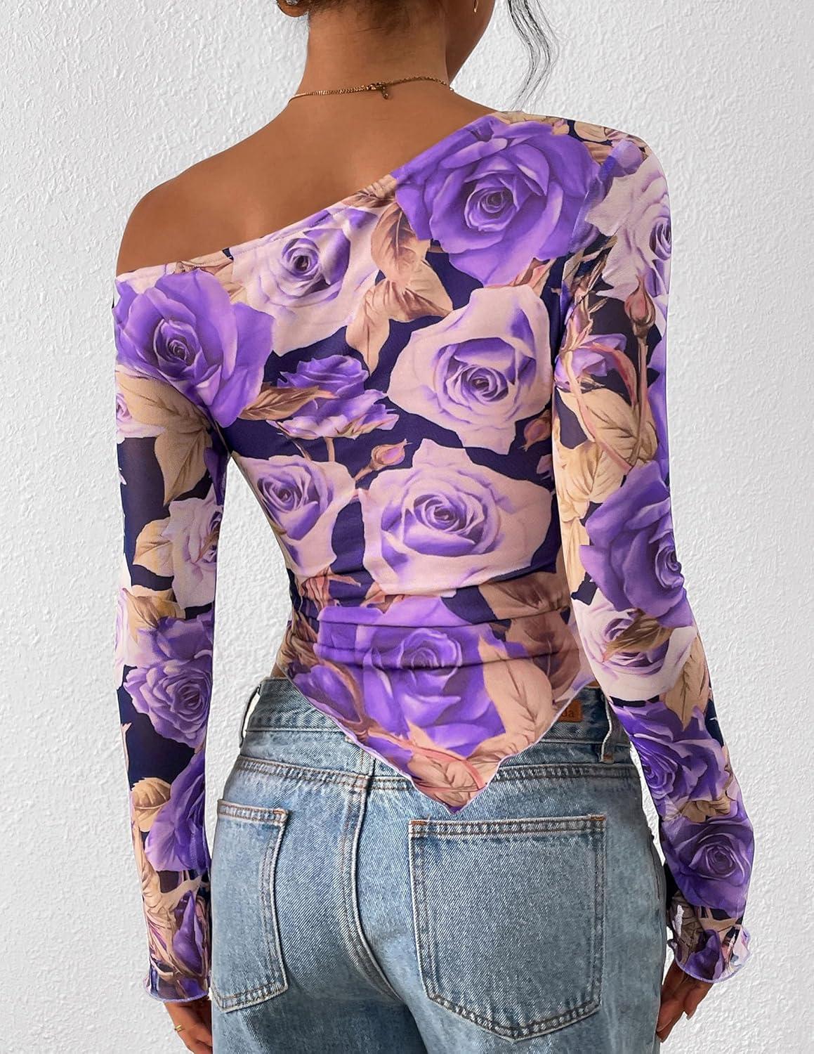 PRETTYGARDEN Womens Fall Trendy Off Shoulder Y2k Tops 2025 Tie Dye Mesh Long Sleeve Shirts Asymmetrical Ruched Floral Blouse(Floral Purple)