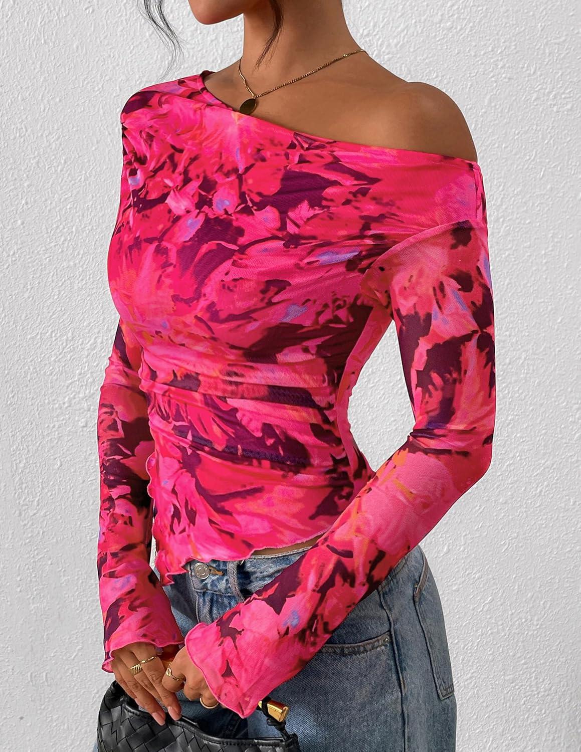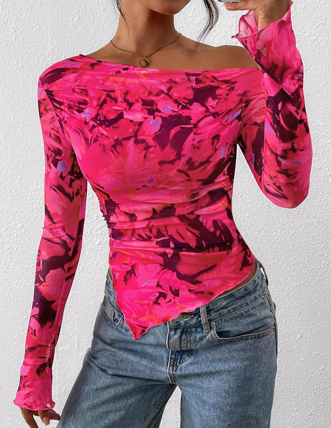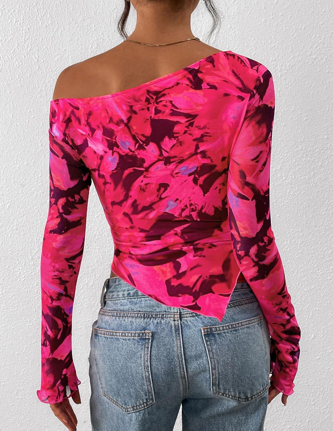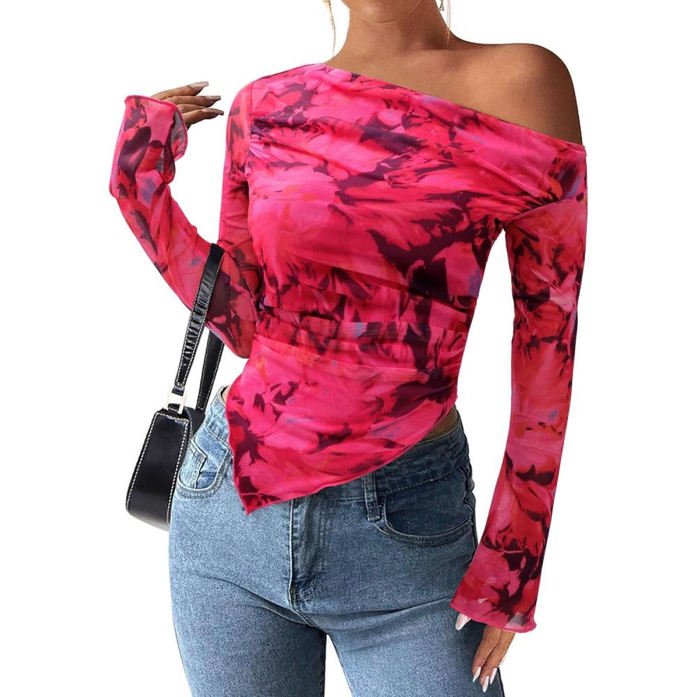 PRETTYGARDEN Womens Fall Trendy Off Shoulder Y2k Tops 2025 Tie Dye Mesh Long Sleeve Shirts Asymmetrical Ruched Floral Blouse(Floral Rose Red)