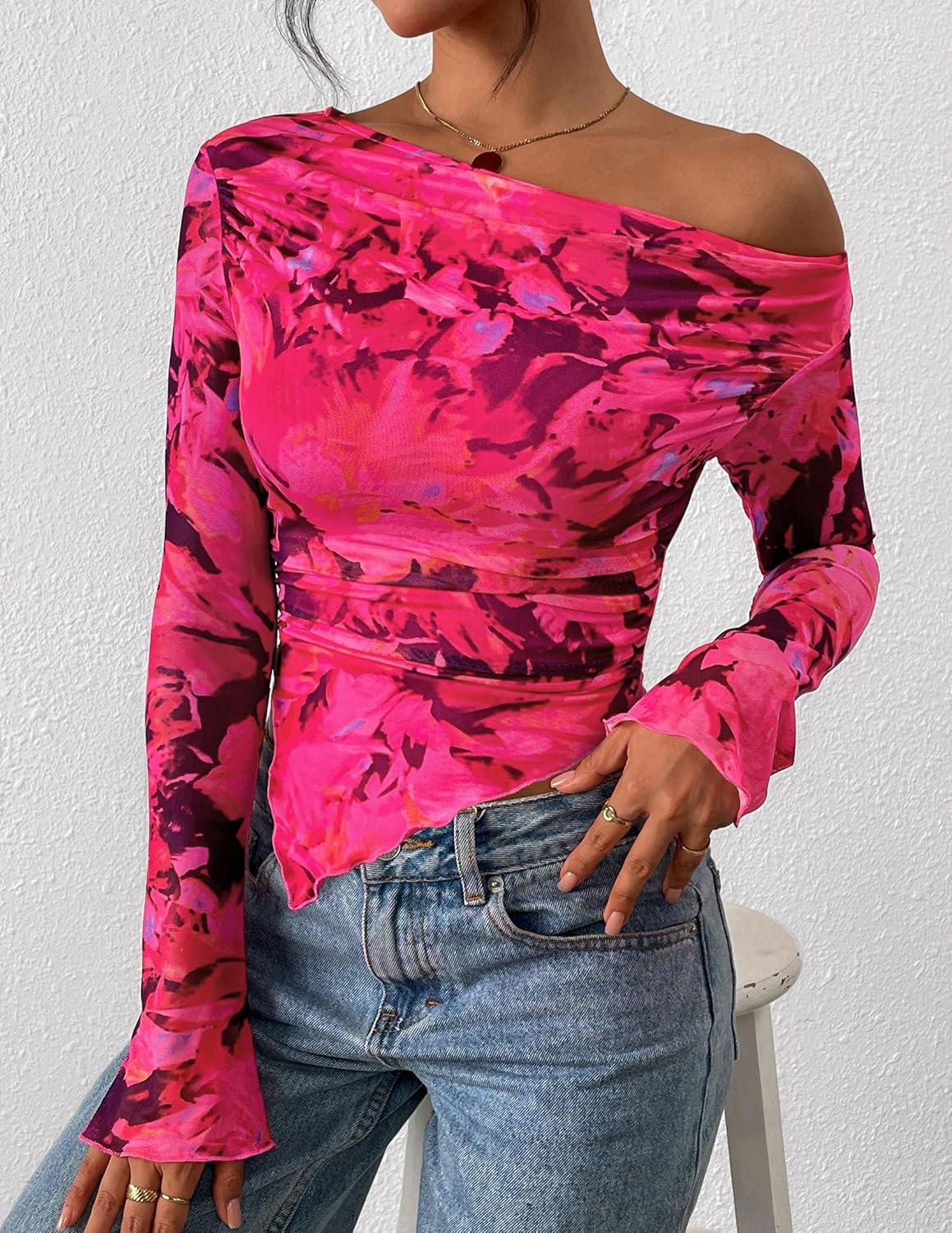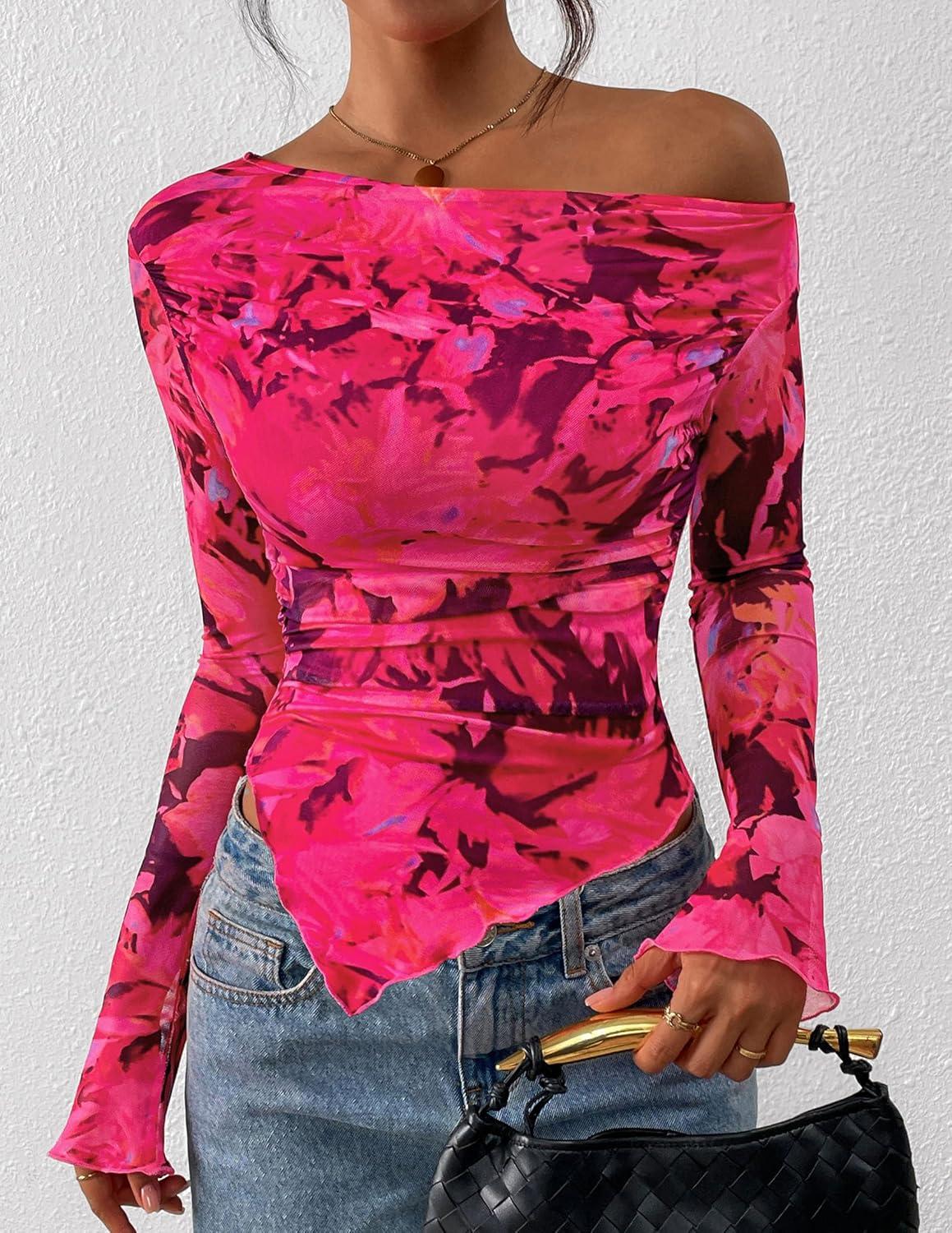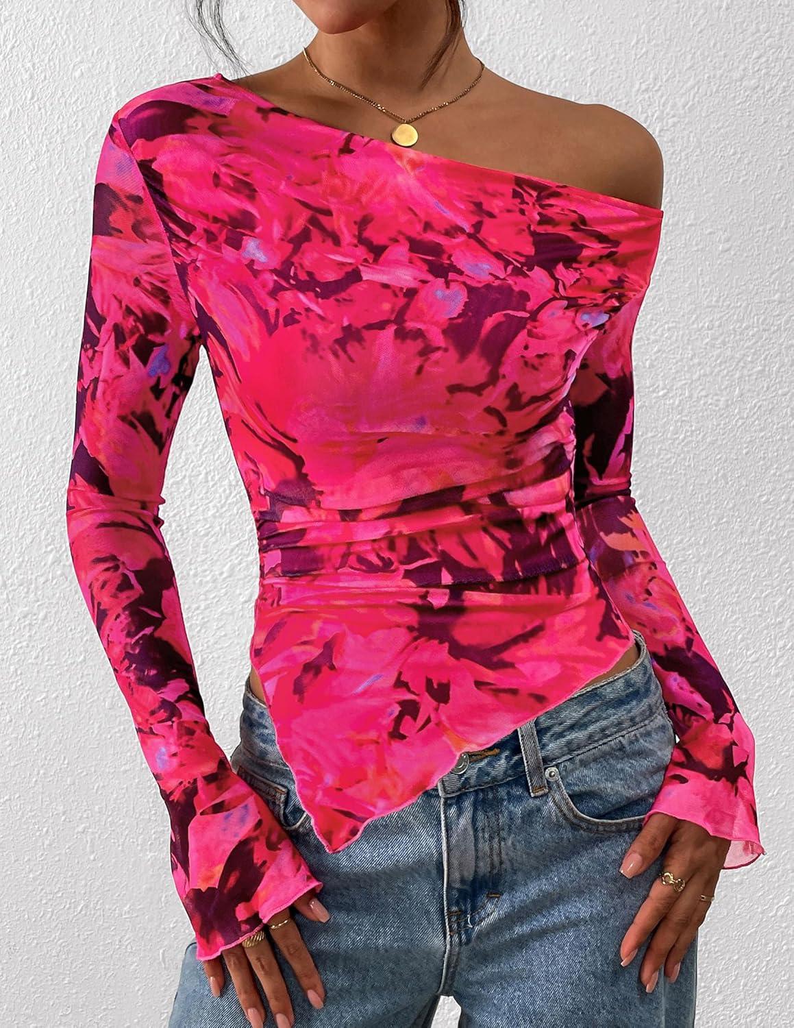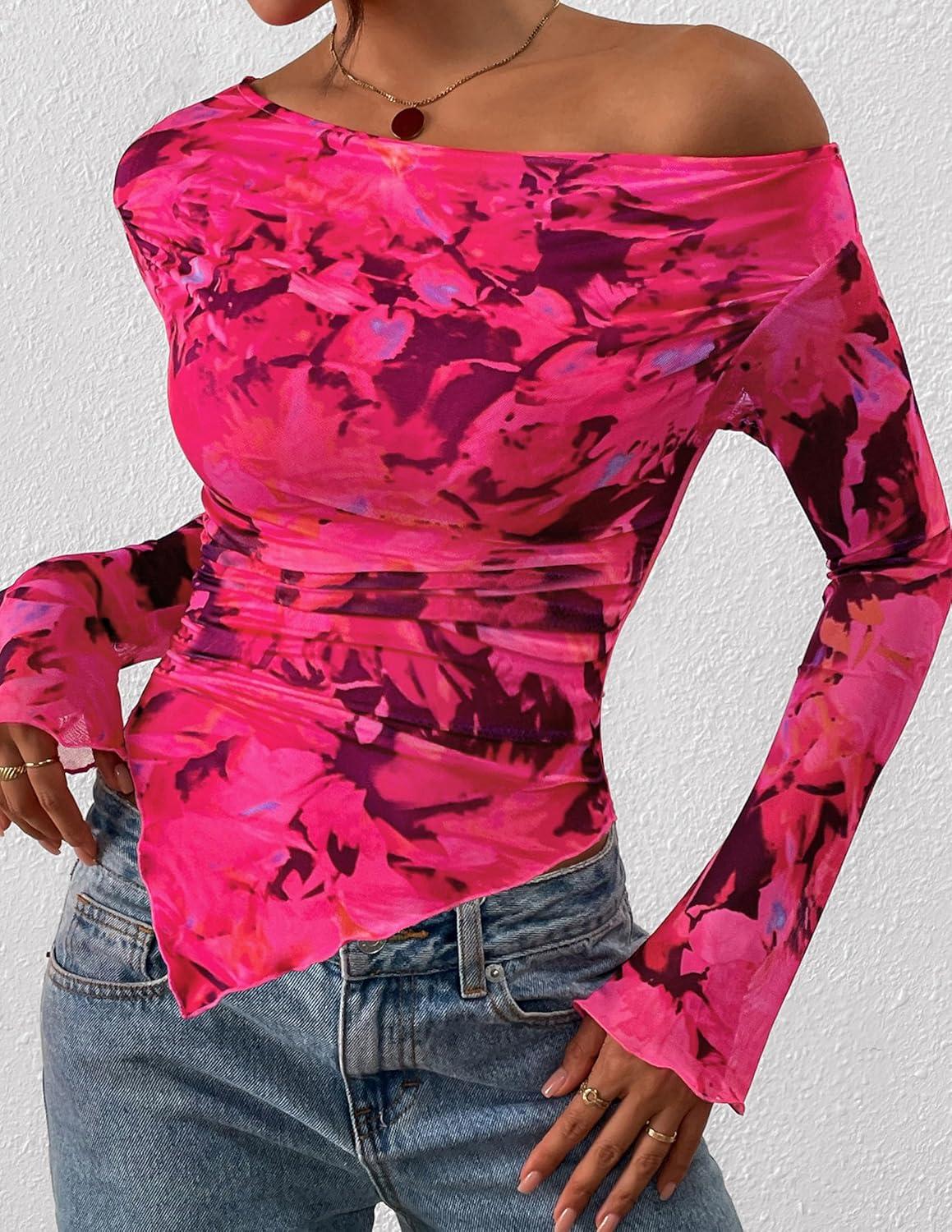 PRETTYGARDEN Womens Fall Trendy Off Shoulder Y2k Tops 2025 Tie Dye Mesh Long Sleeve Shirts Asymmetrical Ruched Floral Blouse(Floral Rose Red)
