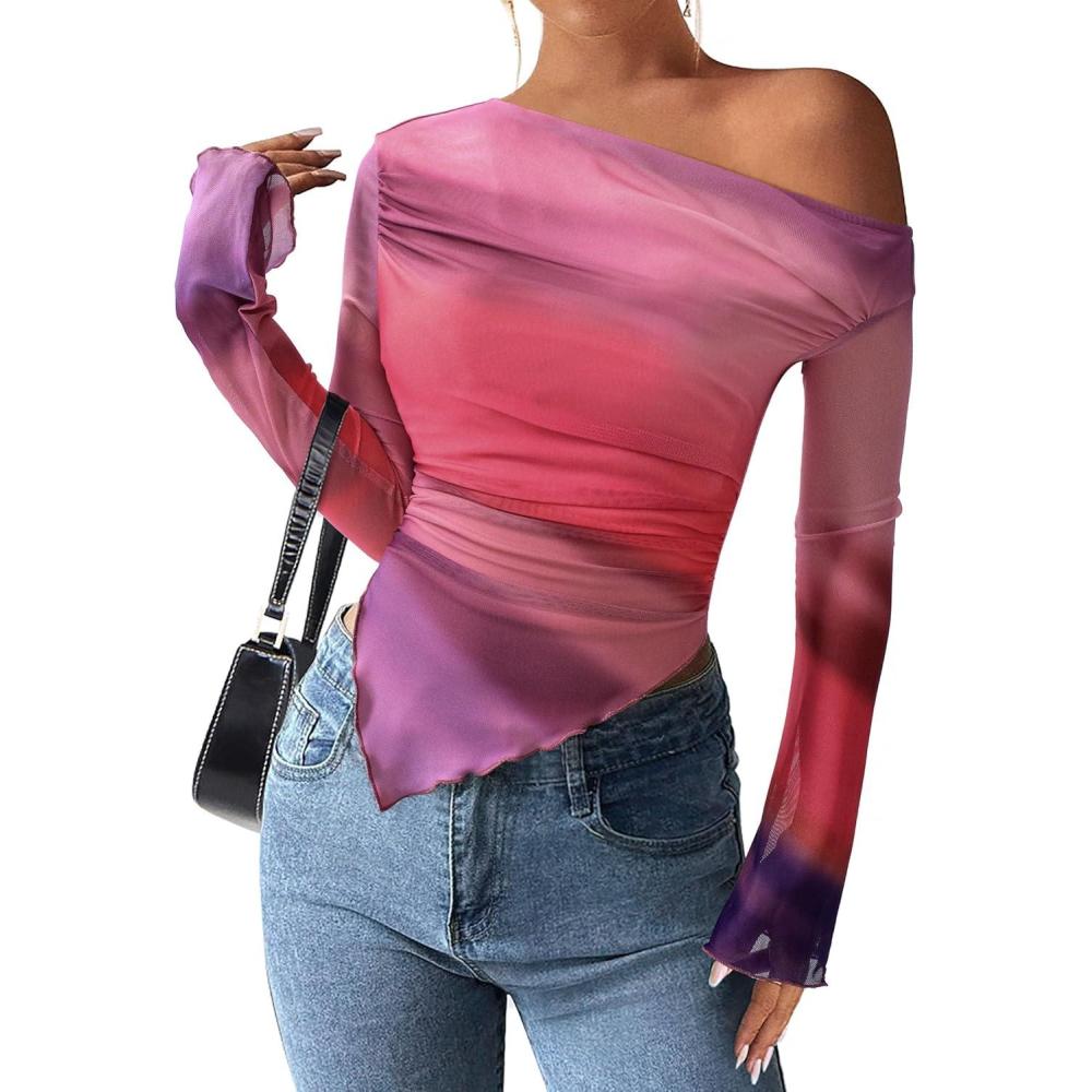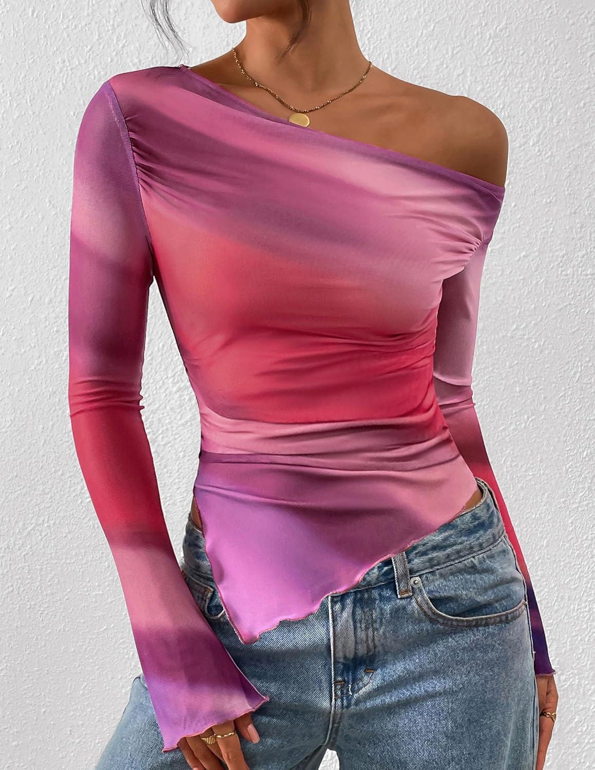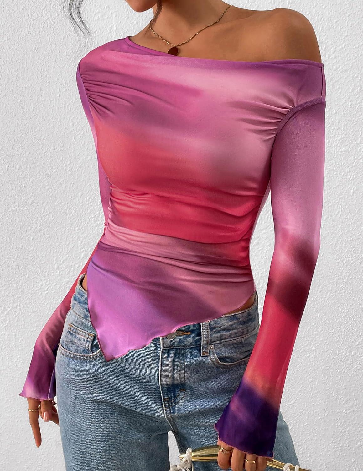 PRETTYGARDEN Womens Fall Trendy Off Shoulder Y2k Tops 2025 Tie Dye Mesh Long Sleeve Shirts Asymmetrical Ruched Floral Blouse(Print Purple)