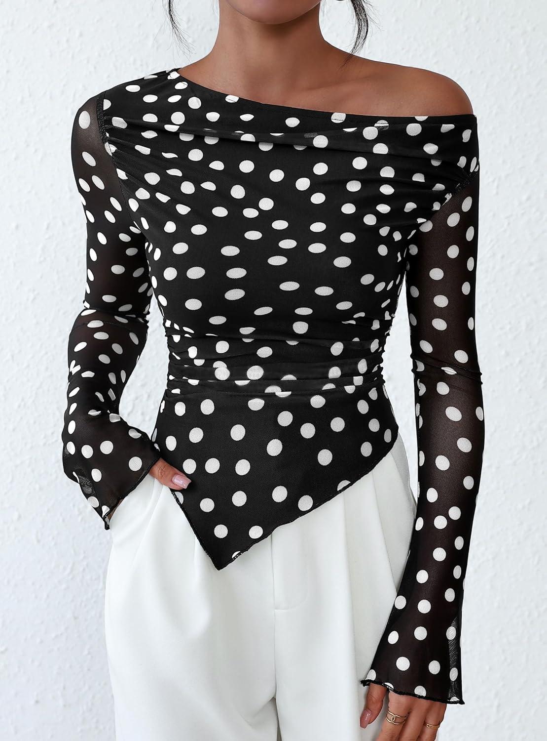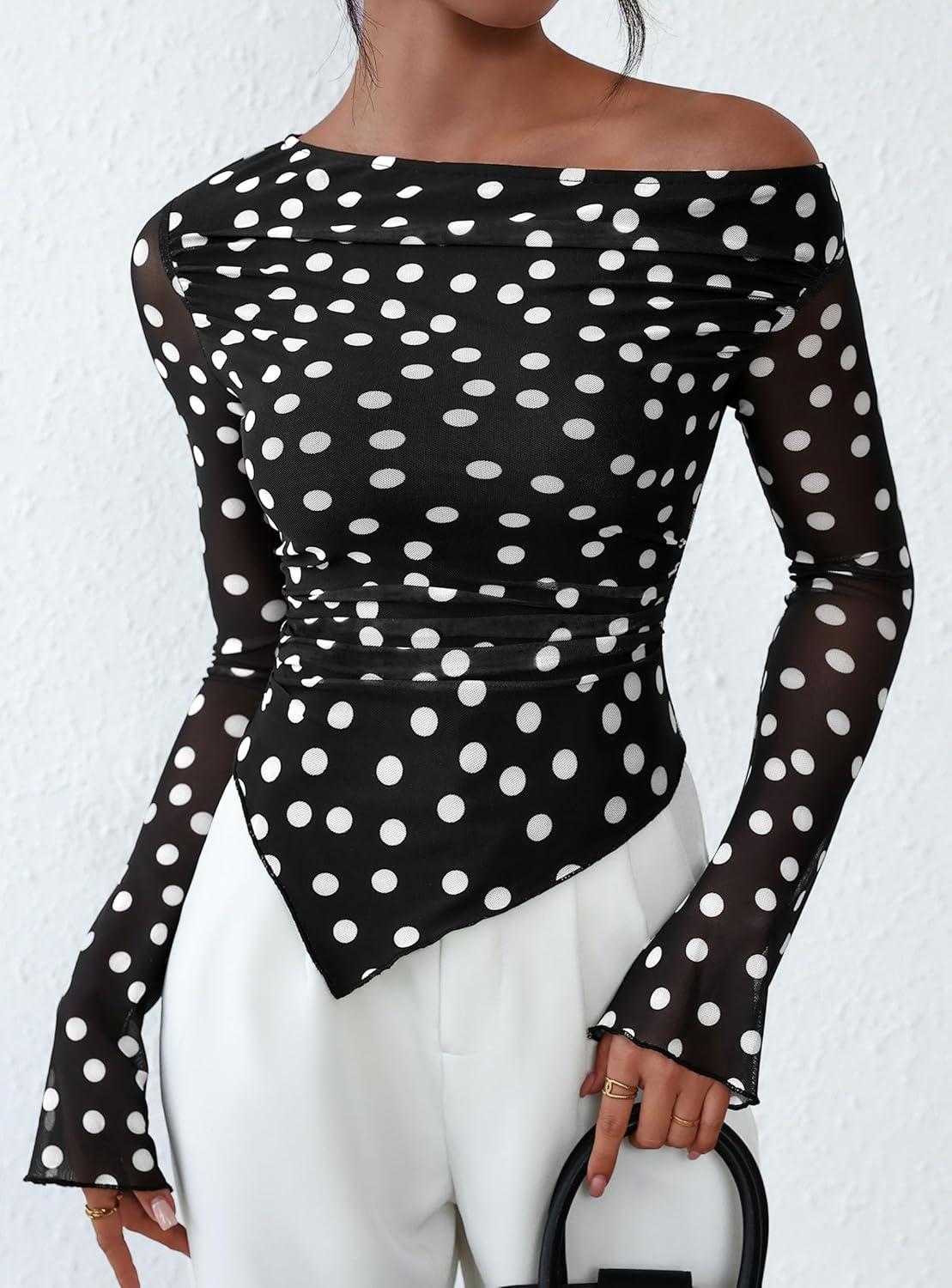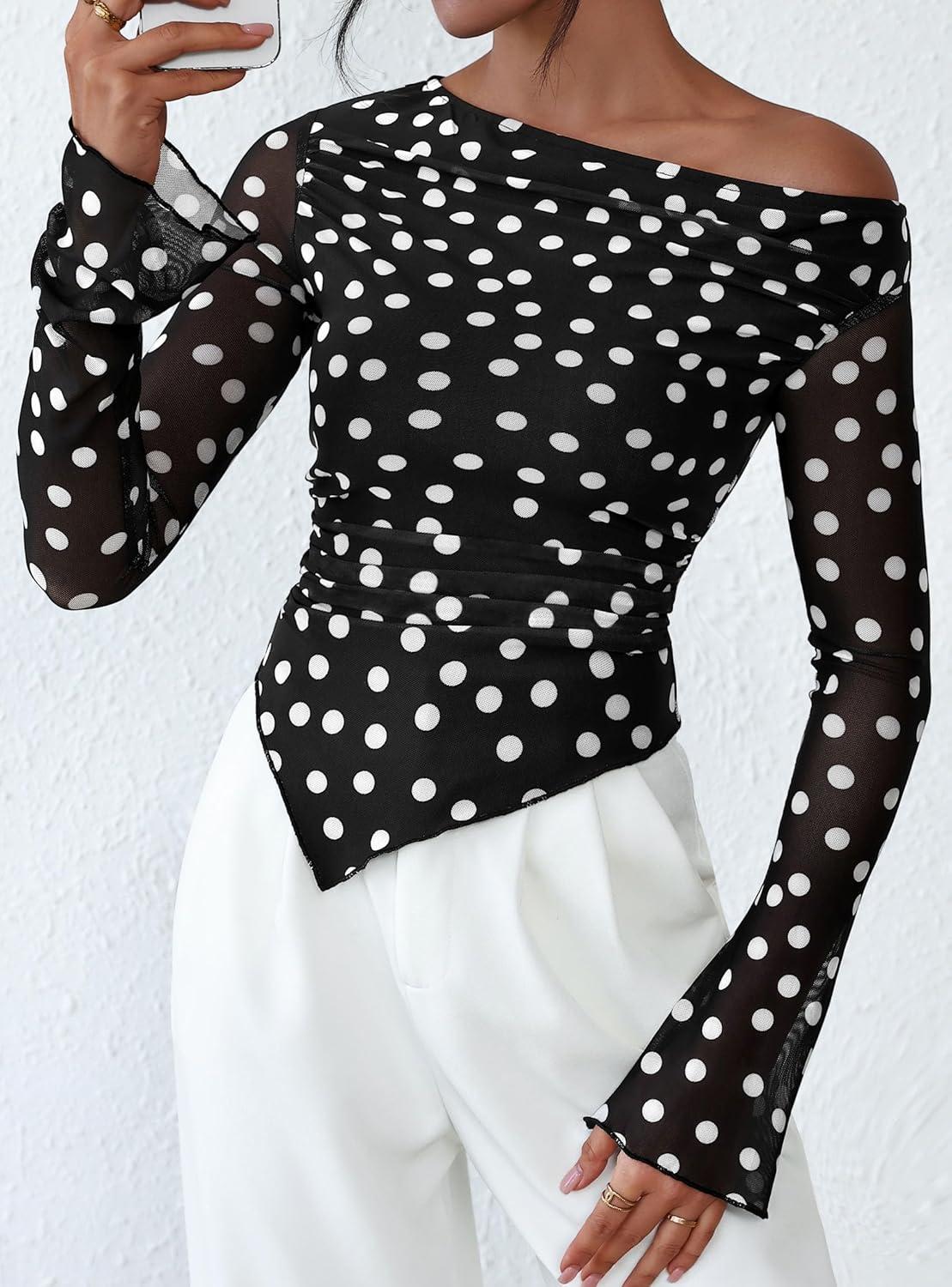 PRETTYGARDEN Womens Fall Trendy Off Shoulder Y2k Tops 2025 Tie Dye Mesh Long Sleeve Shirts Asymmetrical Ruched Floral Blouse(Small Dot Black)