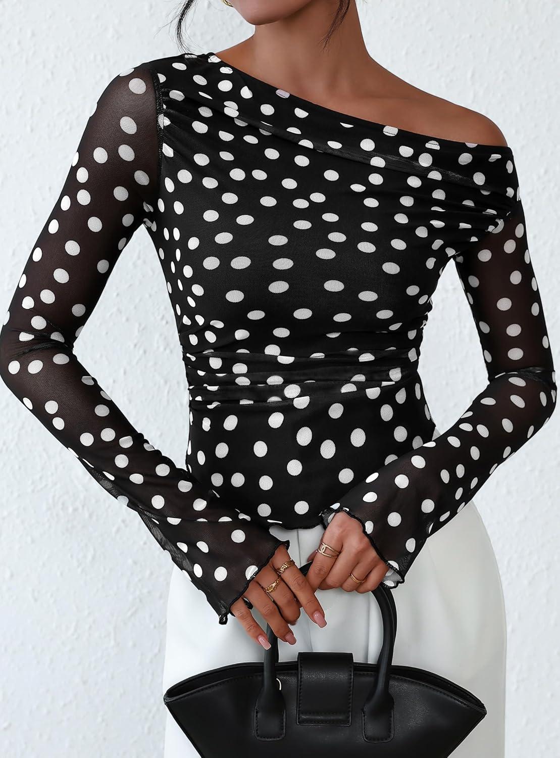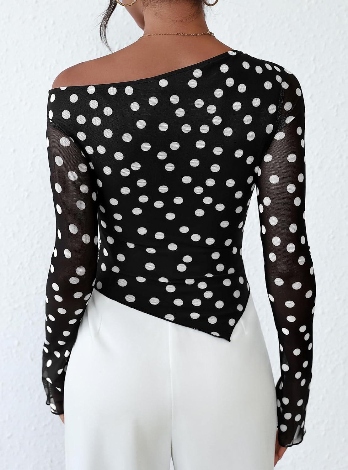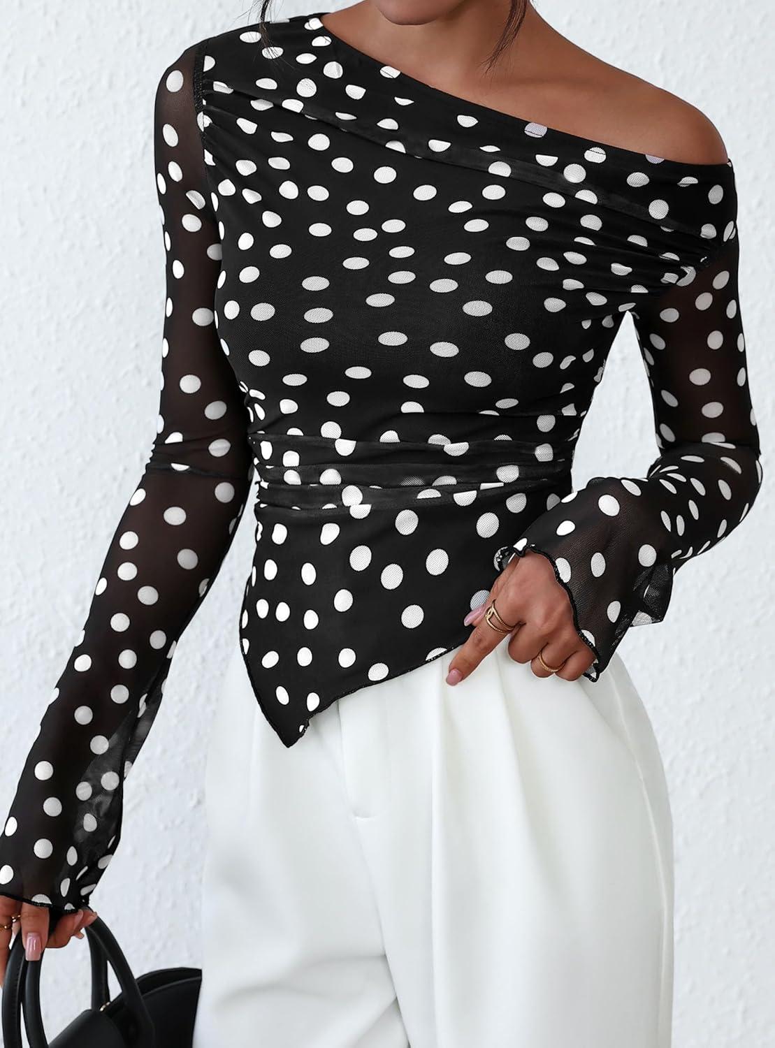 PRETTYGARDEN Womens Fall Trendy Off Shoulder Y2k Tops 2025 Tie Dye Mesh Long Sleeve Shirts Asymmetrical Ruched Floral Blouse(Small Dot Black)