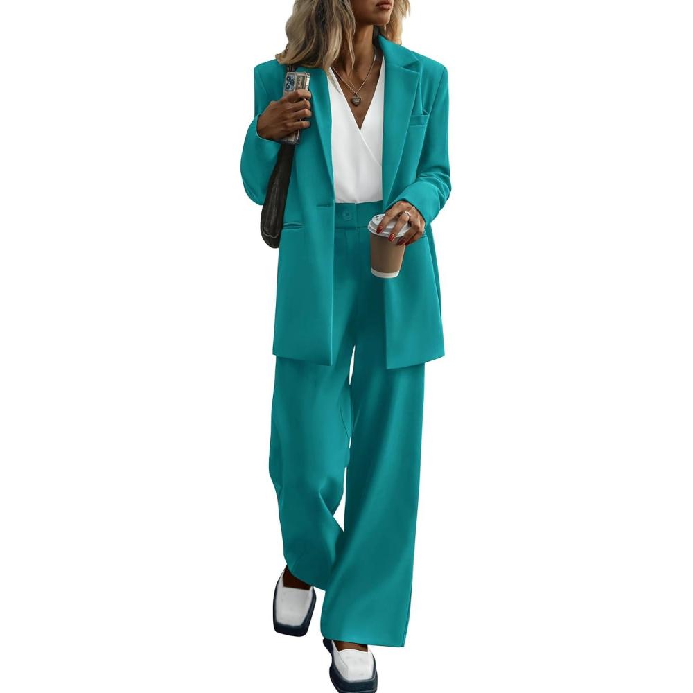 PRETTYGARDEN Women’s Fall Two Piece Outfits Dressy Blazer Jacket and Wide Leg Pants Pockets Business Casual Office Suit Sets(Blue Green)