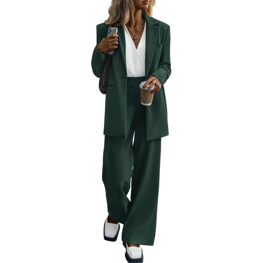 PRETTYGARDEN Women's Fall Two Piece Outfits Dressy Blazer Jacket and Wide Leg Pants Pockets Business Casual Office Suit Sets(Dark Green)