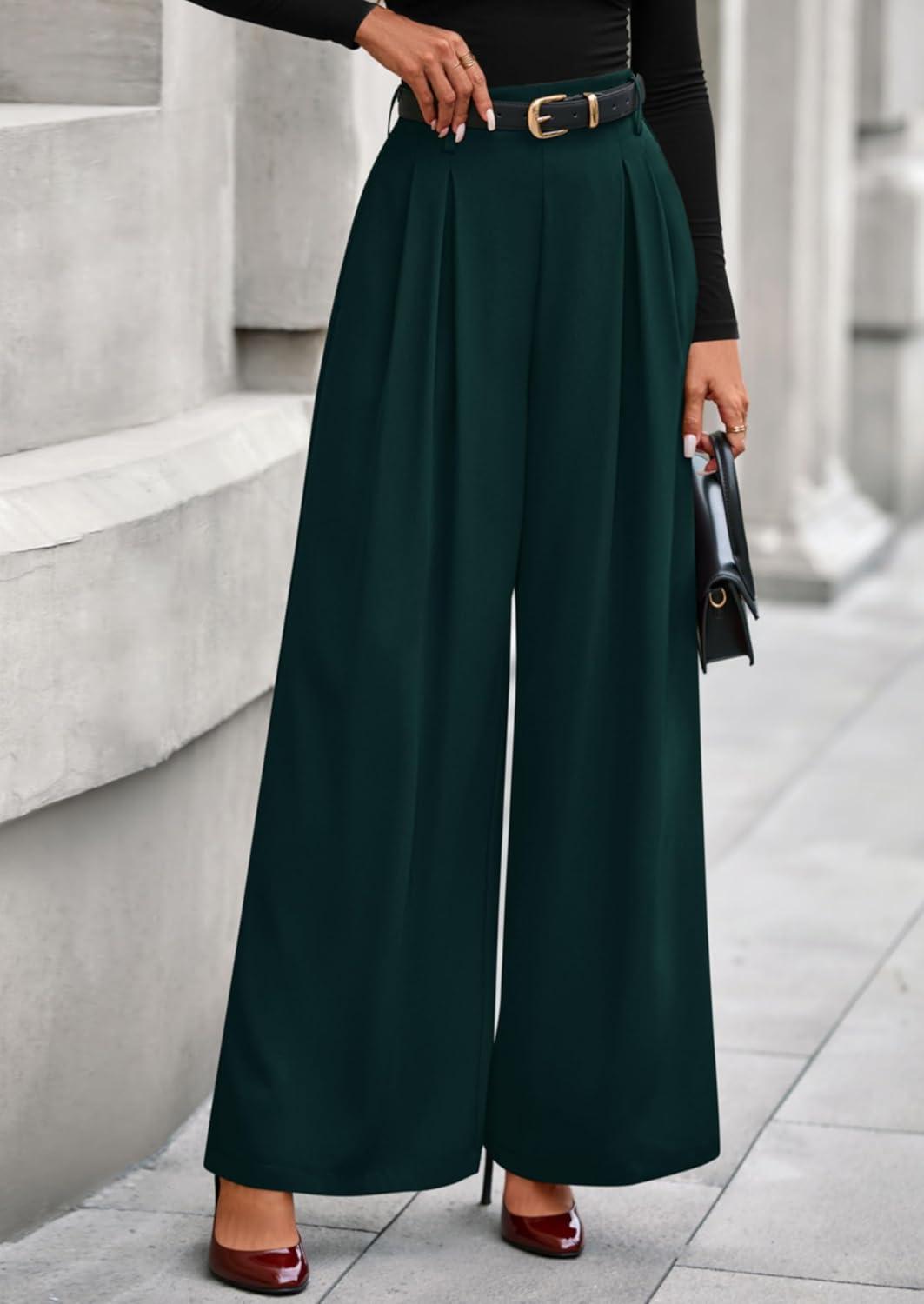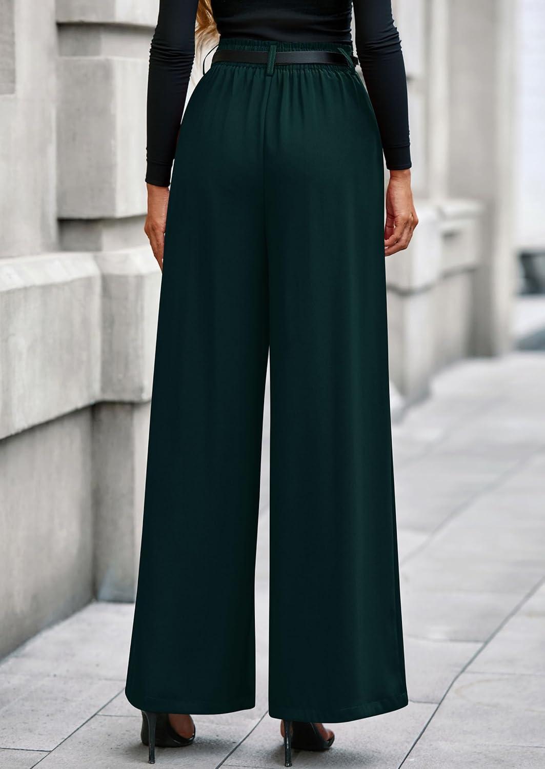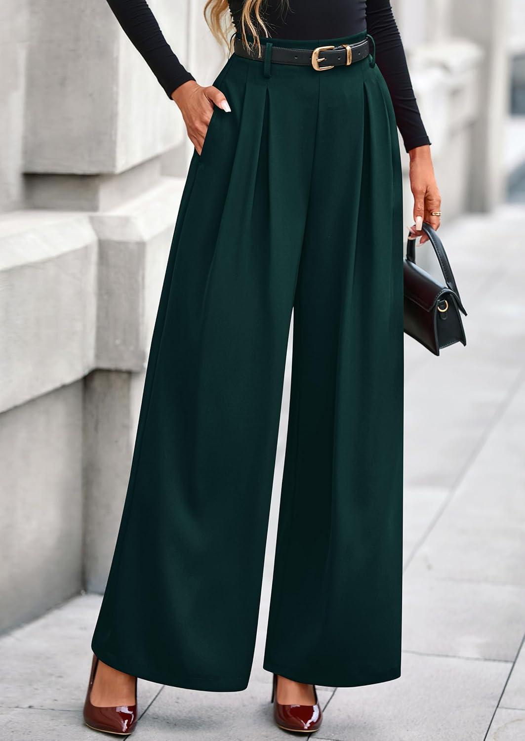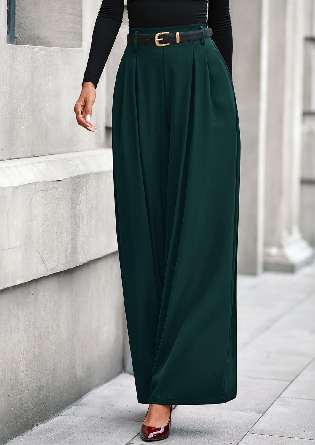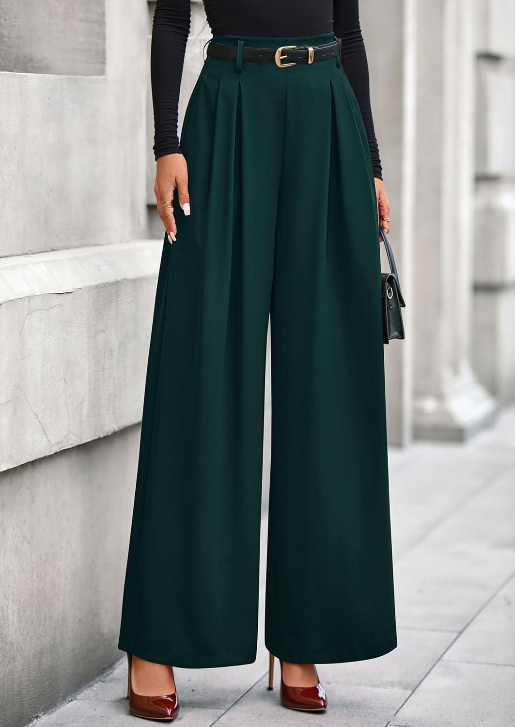 PRETTYGARDEN Womens Fall Wide Leg Trousers 2025 High Elastic Waist Loose Pleated Long Flowy Palazzo Work Pants with Pockets(Dark Green)
