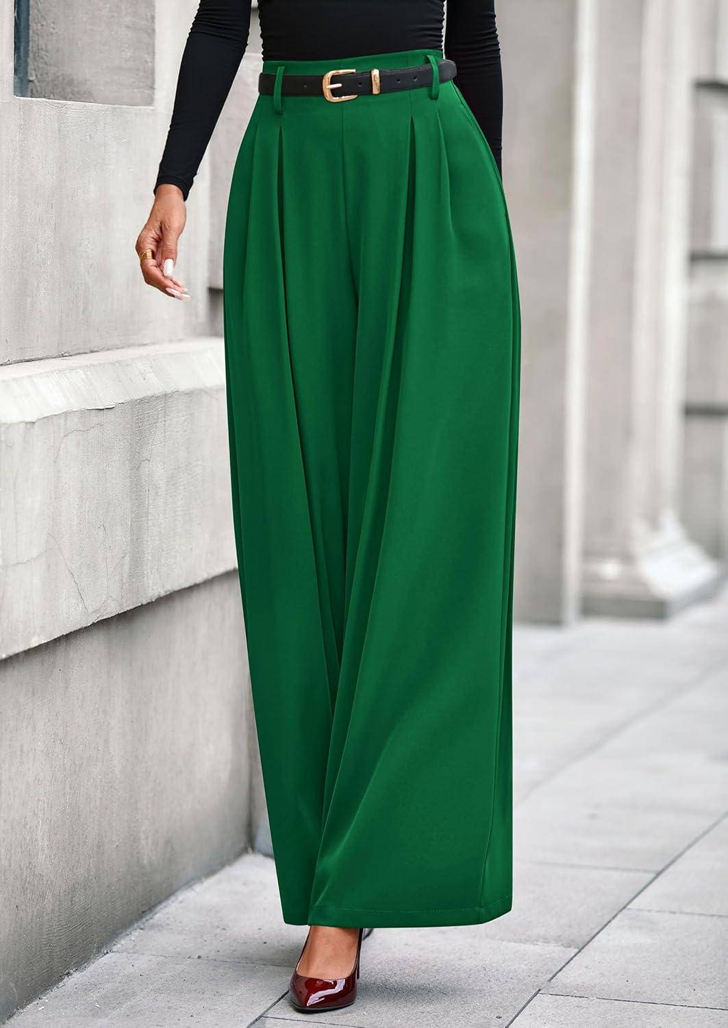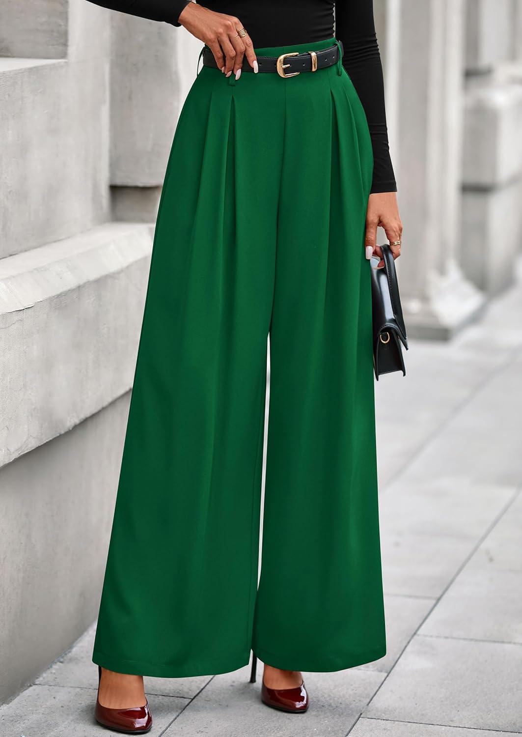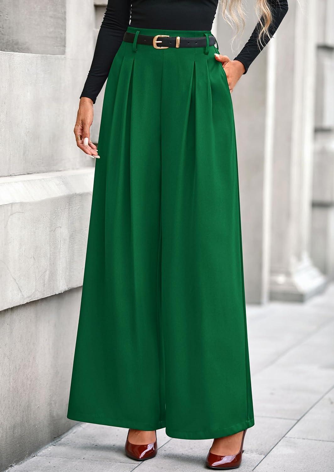 PRETTYGARDEN Womens Fall Wide Leg Trousers 2025 High Elastic Waist Loose Pleated Long Flowy Palazzo Work Pants with Pockets(Green)