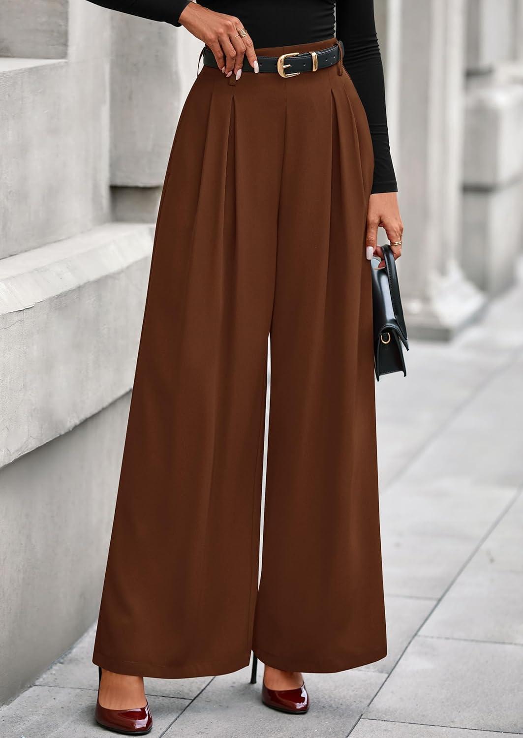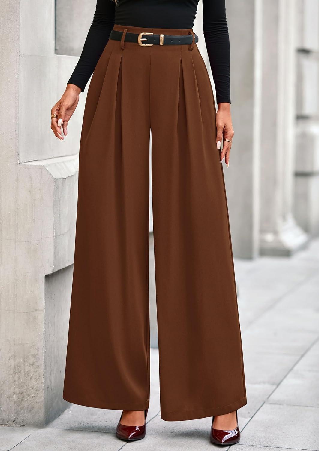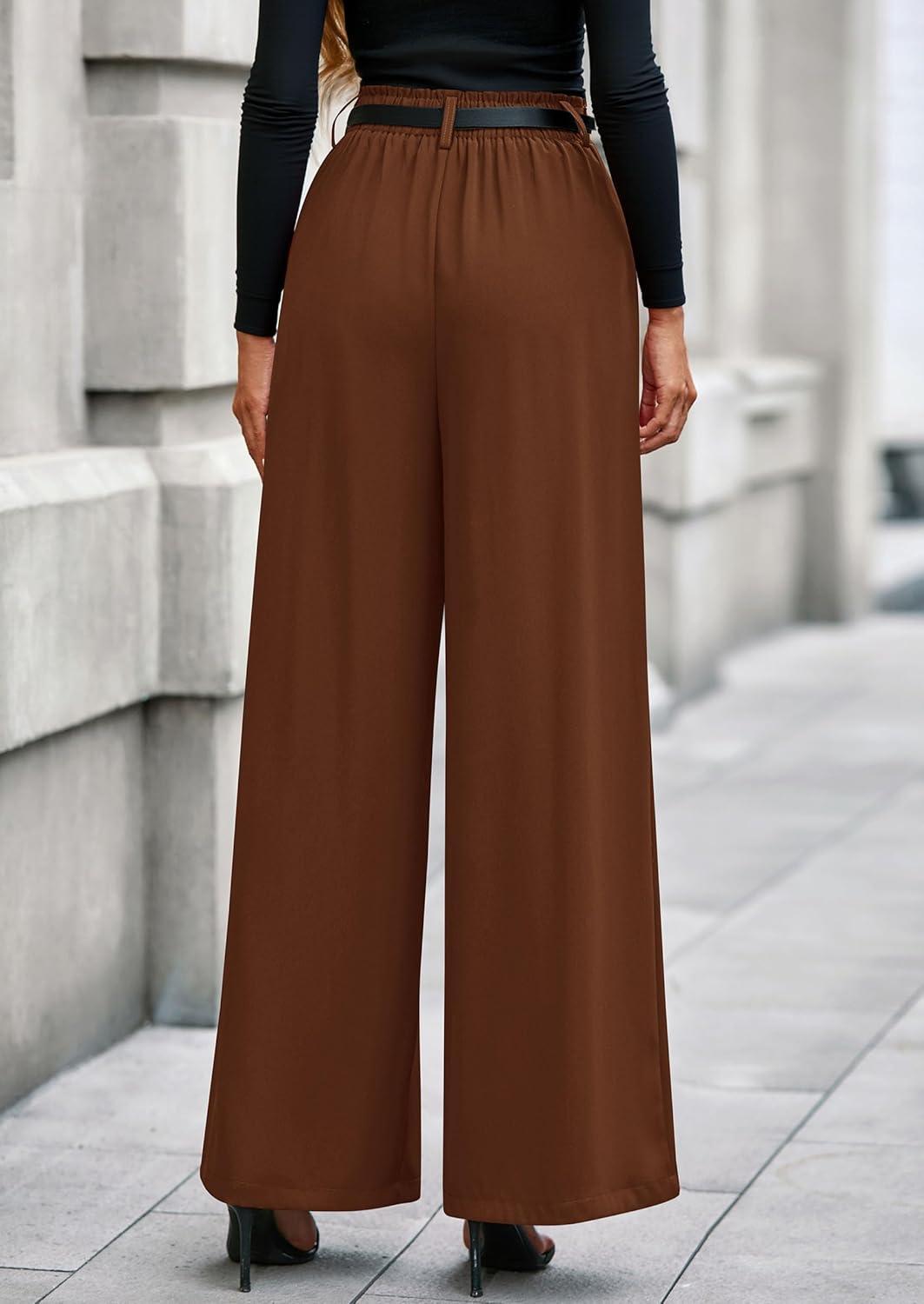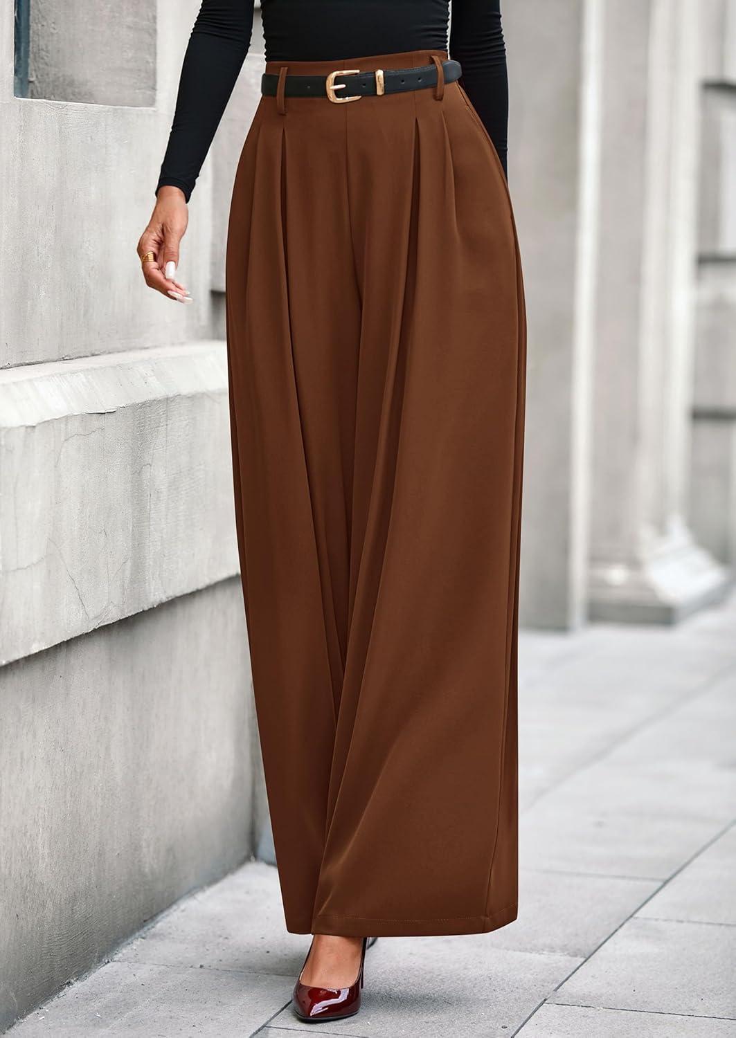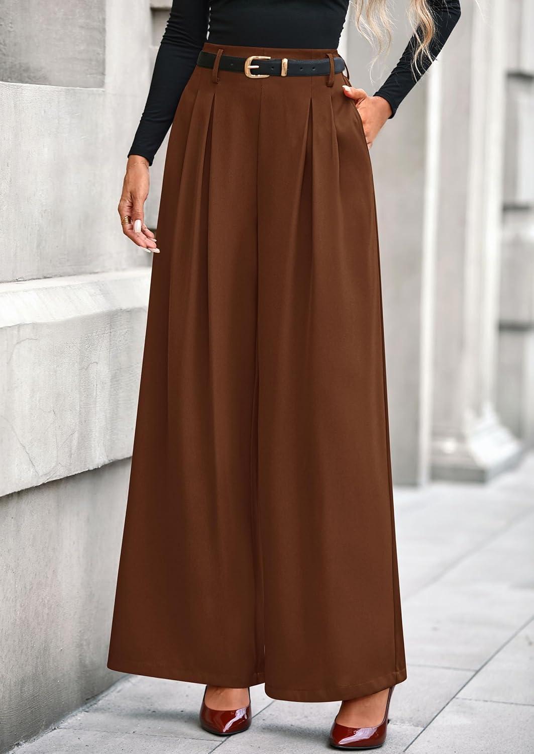 PRETTYGARDEN Womens Fall Wide Leg Trousers 2025 High Elastic Waist Loose Pleated Long Flowy Palazzo Work Pants with Pockets(Red Brown)