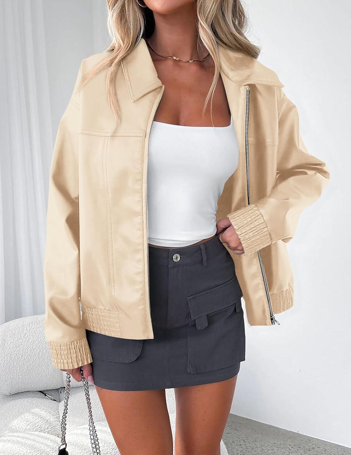 PRETTYGARDEN Women's Faux Leather Jackets 2025 Fall Long Sleeve Bomber Jacket Zip Up Motorcycle Coats Winter Clothes(Beige White)