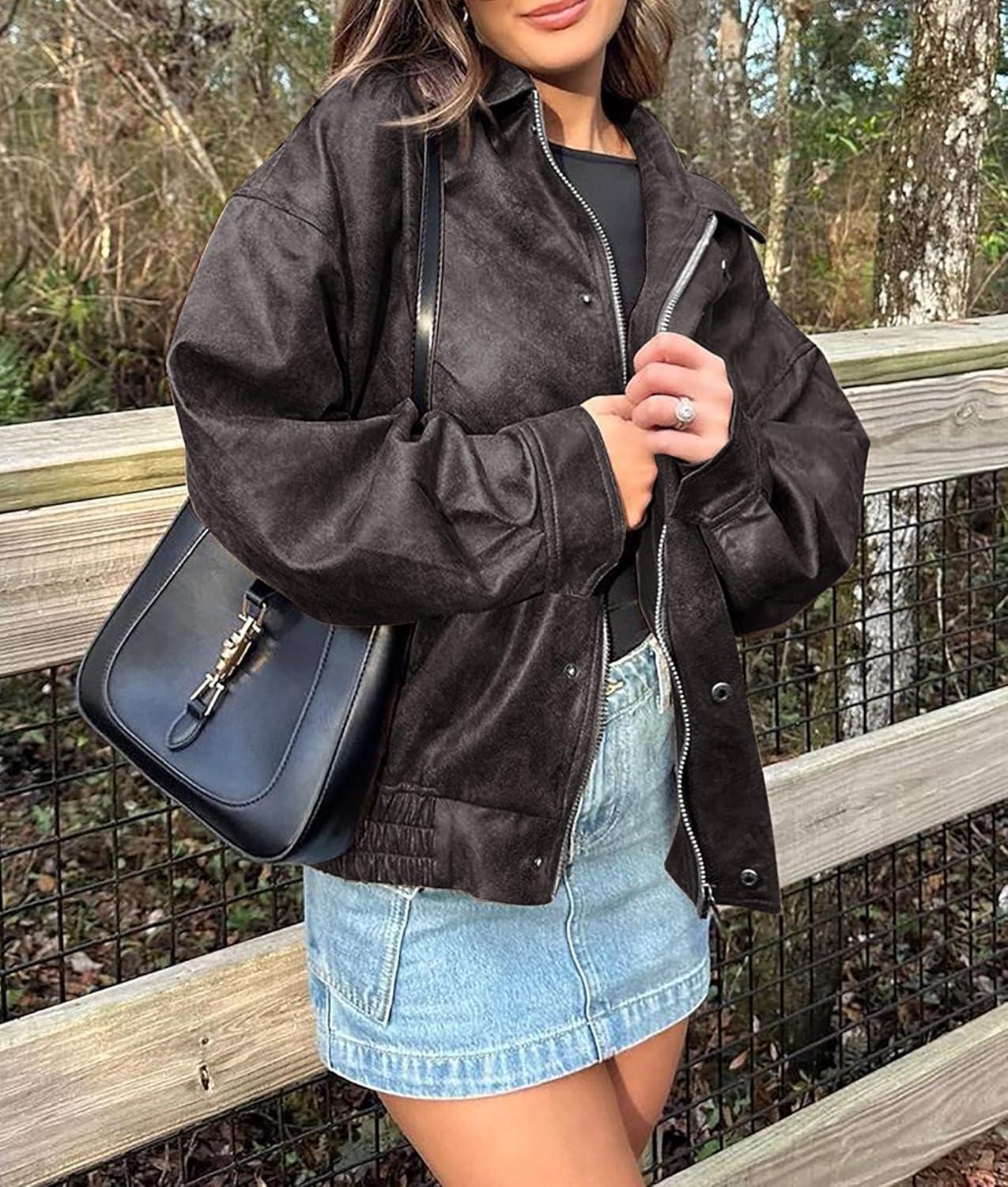 PRETTYGARDEN Women's Faux Leather Motorcycle Jacket Trendy Fall Spring Clothes Oversized Zip Up Winter Coat Outerwear(Style2-black Grey)