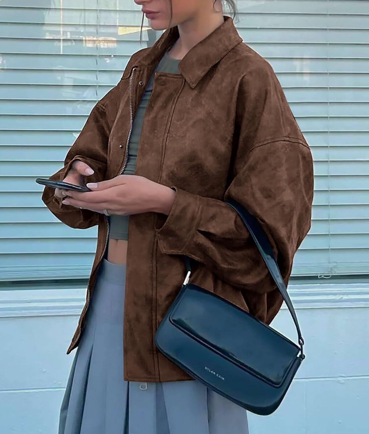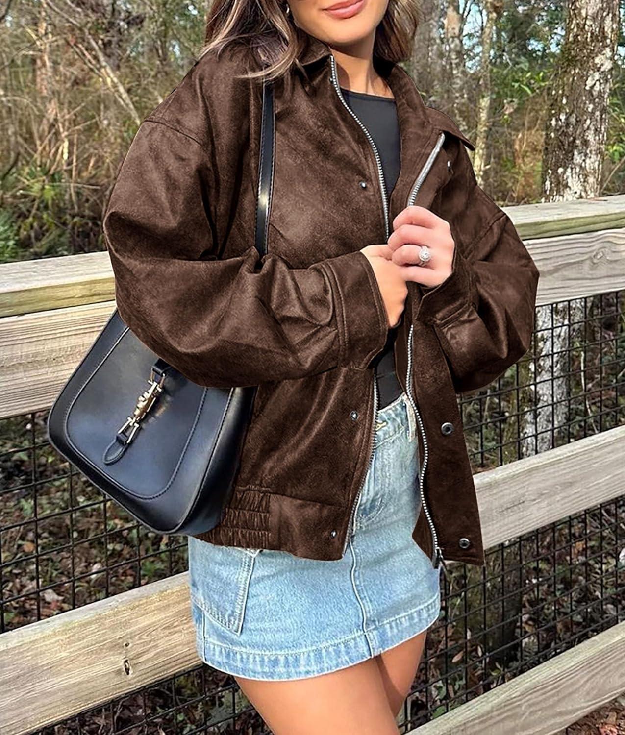 PRETTYGARDEN Women's Faux Leather Motorcycle Jacket Trendy Fall Spring Clothes Oversized Zip Up Winter Coat Outerwear(Style2-brown)