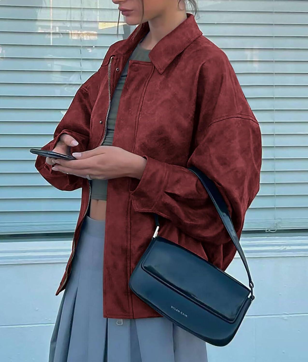 PRETTYGARDEN Women's Faux Leather Motorcycle Jacket Trendy Fall Spring Clothes Oversized Zip Up Winter Coat Outerwear(Style2-wine Red)