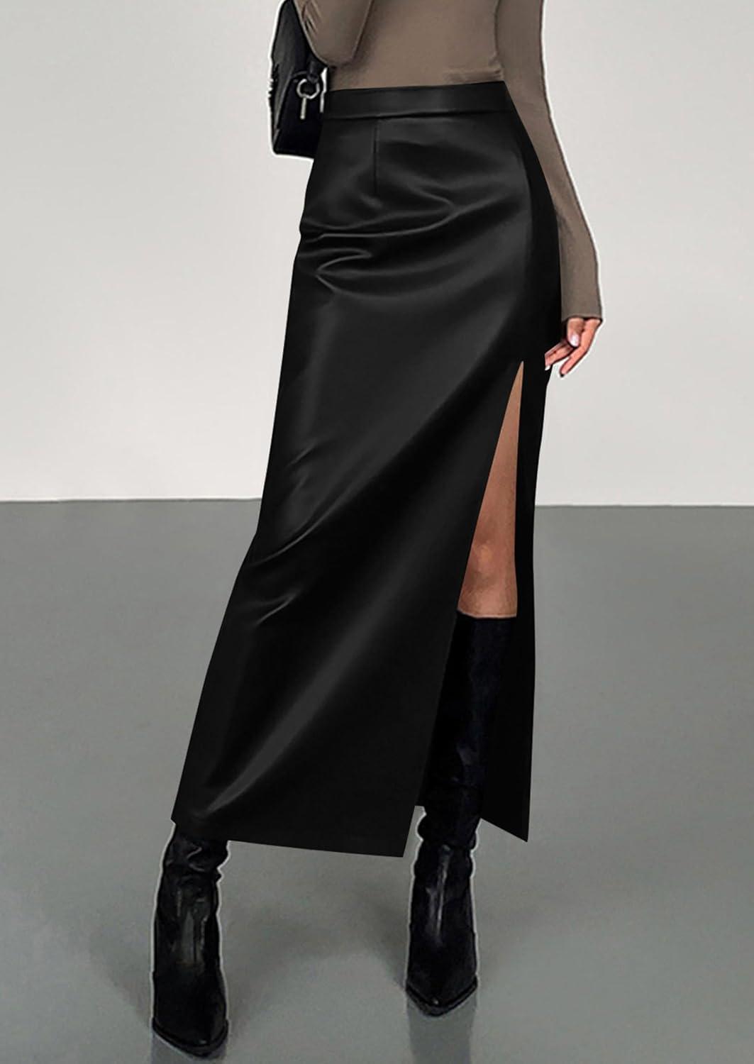 PRETTYGARDEN Womens Faux Leather Skirts 2025 Fall Fashion Bodycon High Waisted Slit Work Office Winter Maxi Long Pencil Skirt(Black)