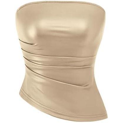 PRETTYGARDEN Women's Faux Leather Tube Tops 2025 Summer Strapless Asymmetrical Ruched Bandeau Shirts Going Out Club Outfits(Champagne)