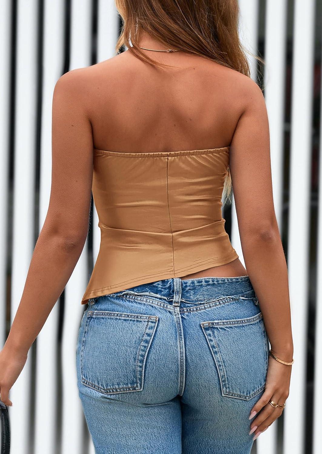 PRETTYGARDEN Women’s Faux Leather Tube Tops 2025 Summer Strapless Asymmetrical Ruched Bandeau Shirts Going Out Club Outfits(Light Brown)