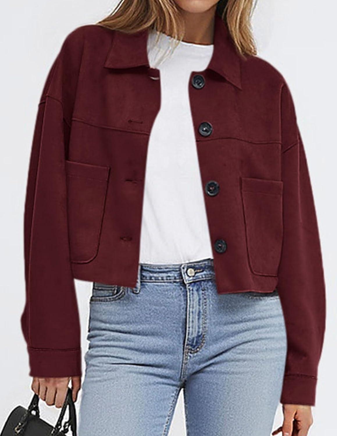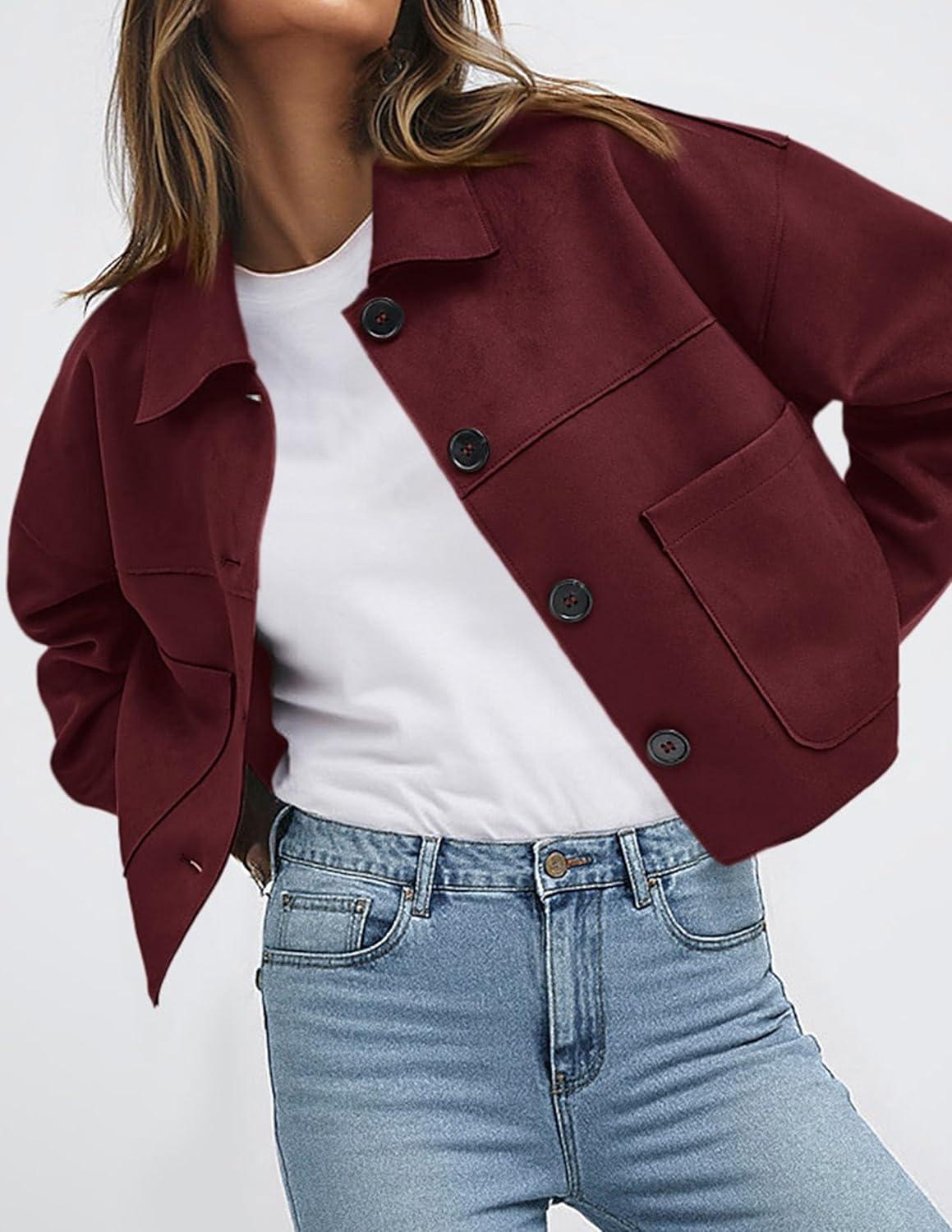 PRETTYGARDEN Women's Faux Suede Cropped Jacket Casual Lightweight Fall Fashion 2025 Winter Coats Outerwear Trendy Clothes(Burgundy)