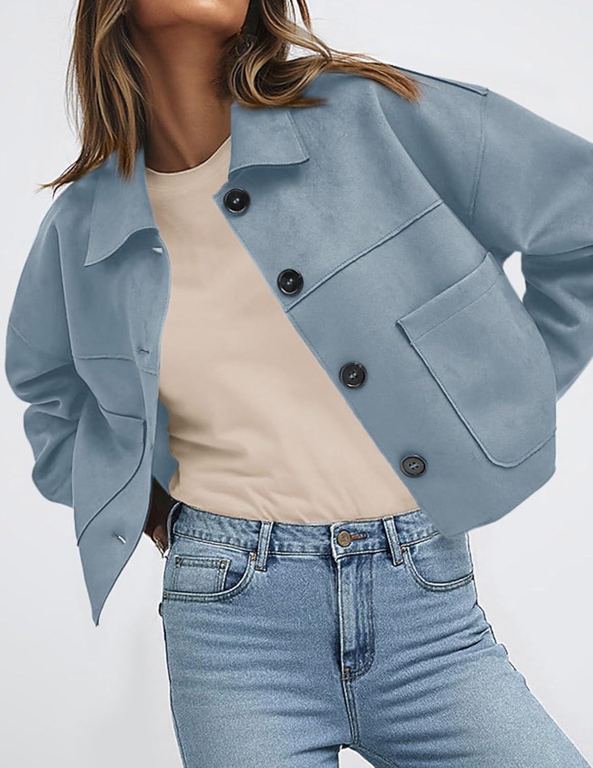 PRETTYGARDEN Women's Faux Suede Cropped Jacket Casual Lightweight Fall Fashion 2025 Winter Coats Outerwear Trendy Clothes(Light Blue)