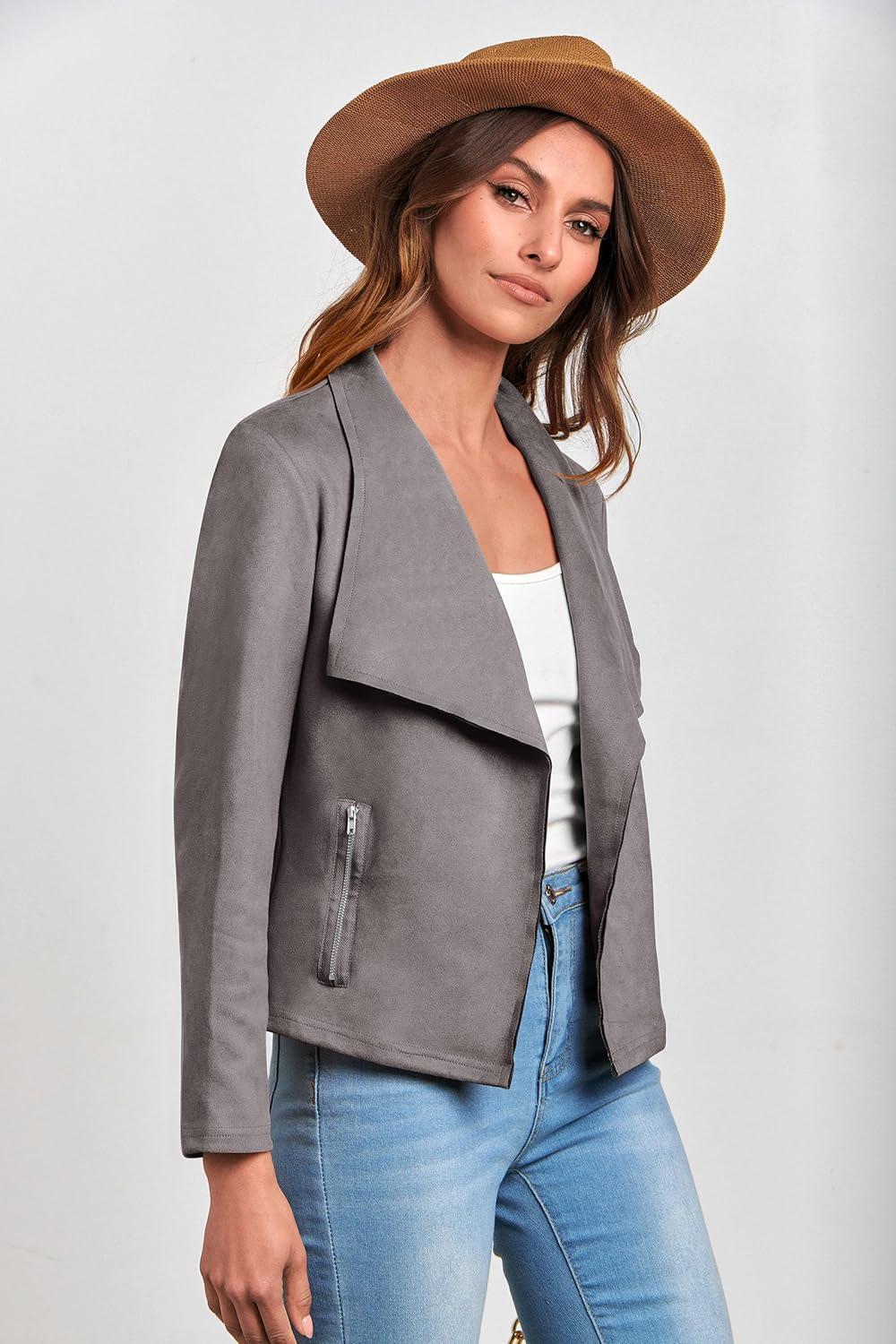 PRETTYGARDEN Women’s Faux Suede Jackets 2025 Fashion Fall Clothes Long Sleeve Open Front Cropped Coat Outwear(Grey)