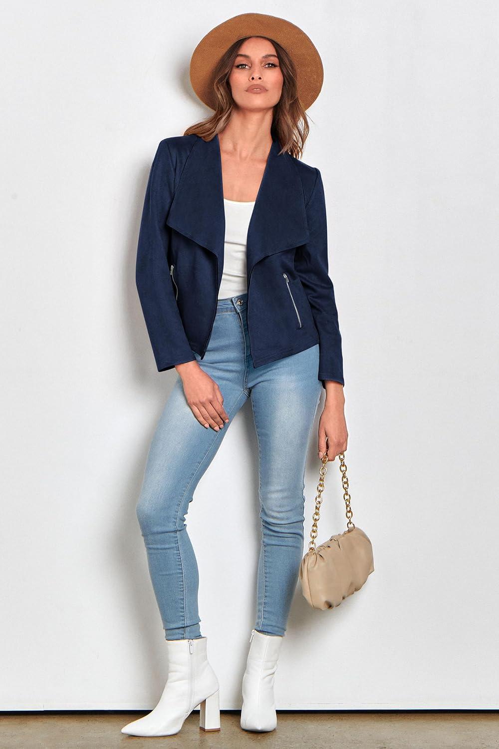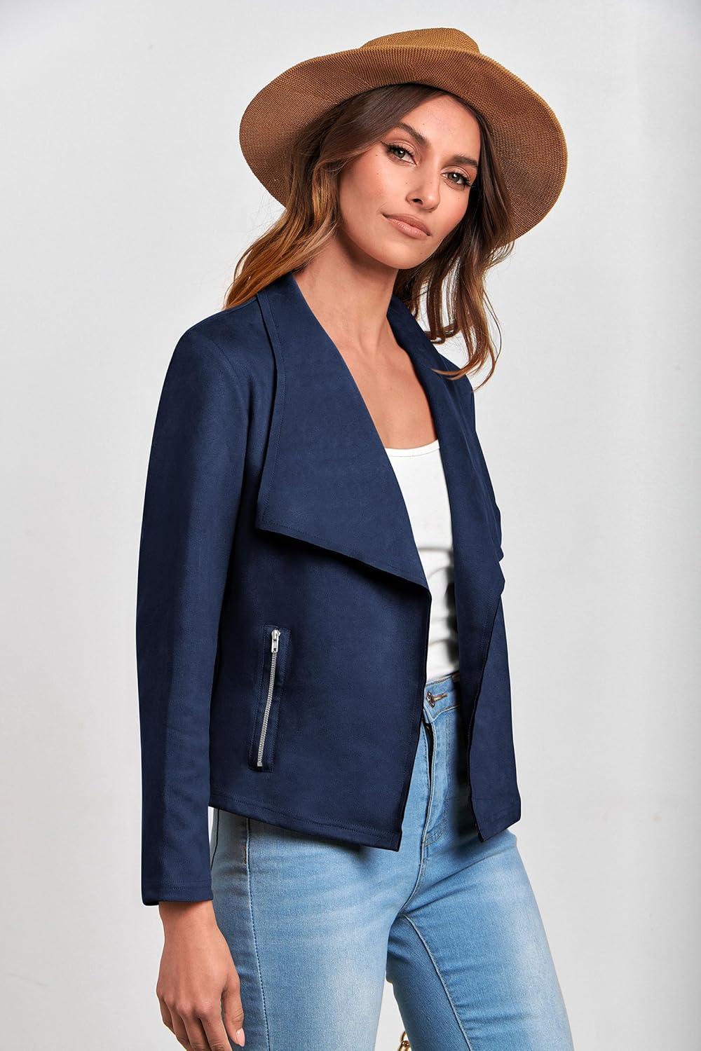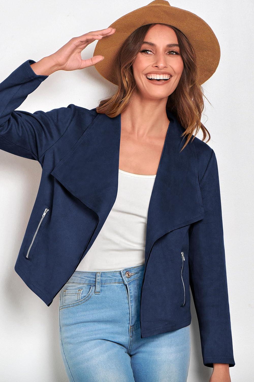 PRETTYGARDEN Women’s Faux Suede Jackets 2025 Fashion Fall Clothes Long Sleeve Open Front Cropped Coat Outwear(Navy)