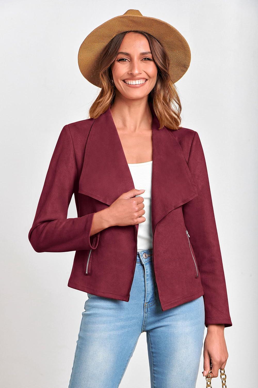PRETTYGARDEN Women’s Faux Suede Jackets 2025 Fashion Fall Clothes Long Sleeve Open Front Cropped Coat Outwear(Wine Red)