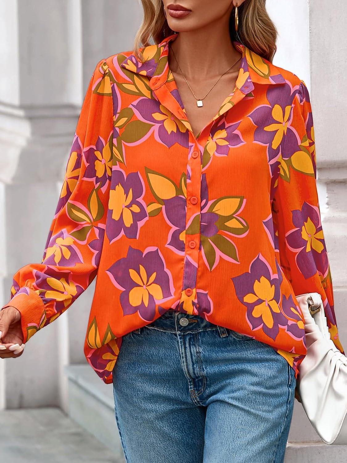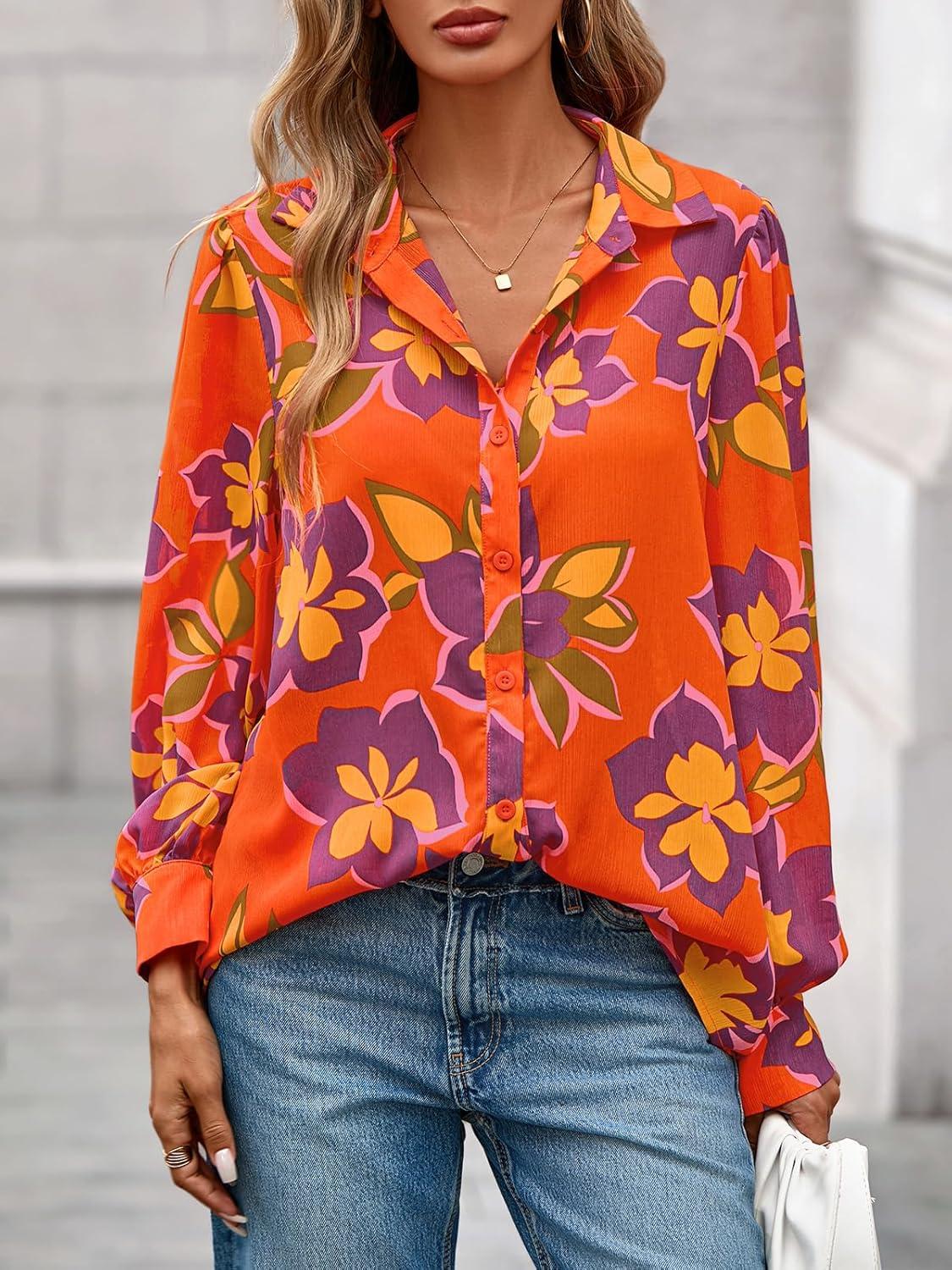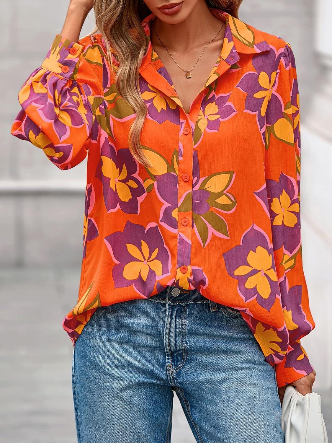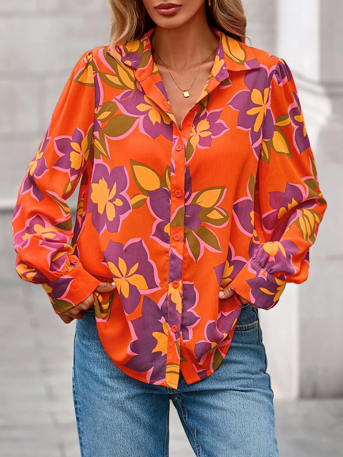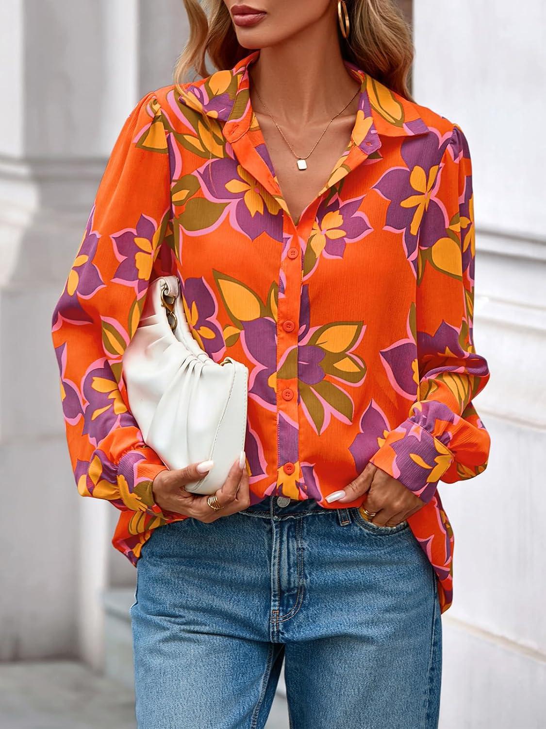 PRETTYGARDEN Women's Floral Blouses Dressy Casual V Neck Button Down Shirts Lantern Long Sleeve Boho Chiffon Fall Tops 2025(Floral Orange Purple)