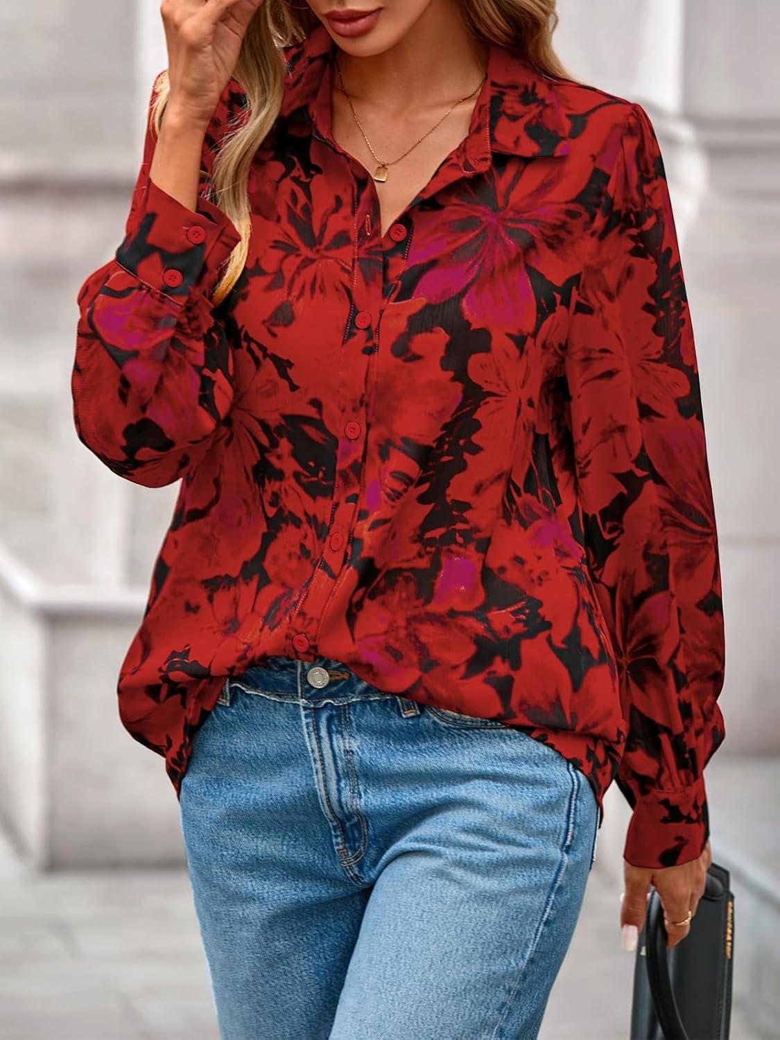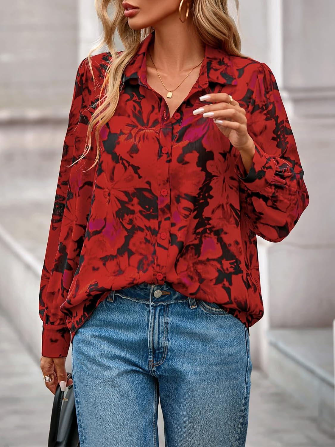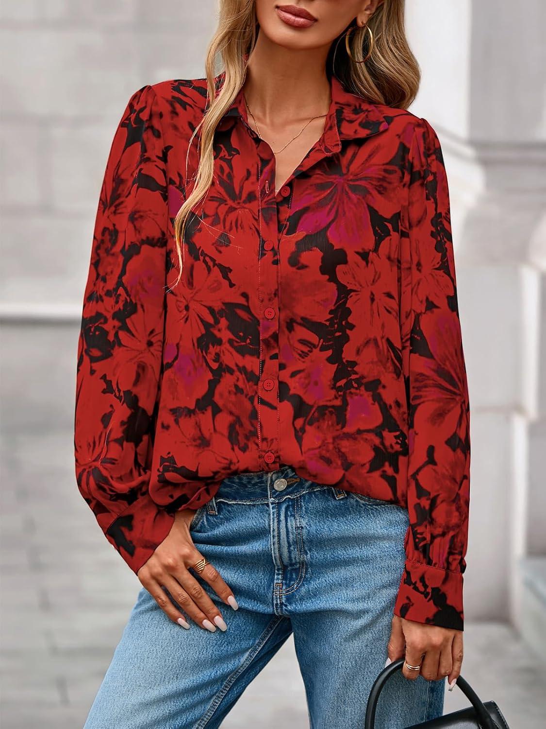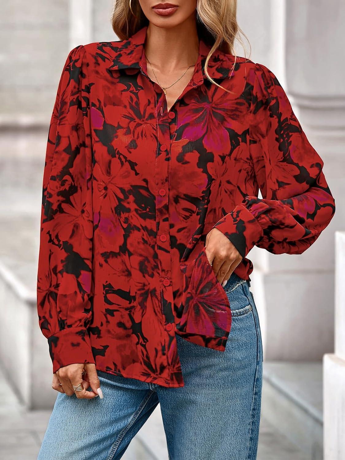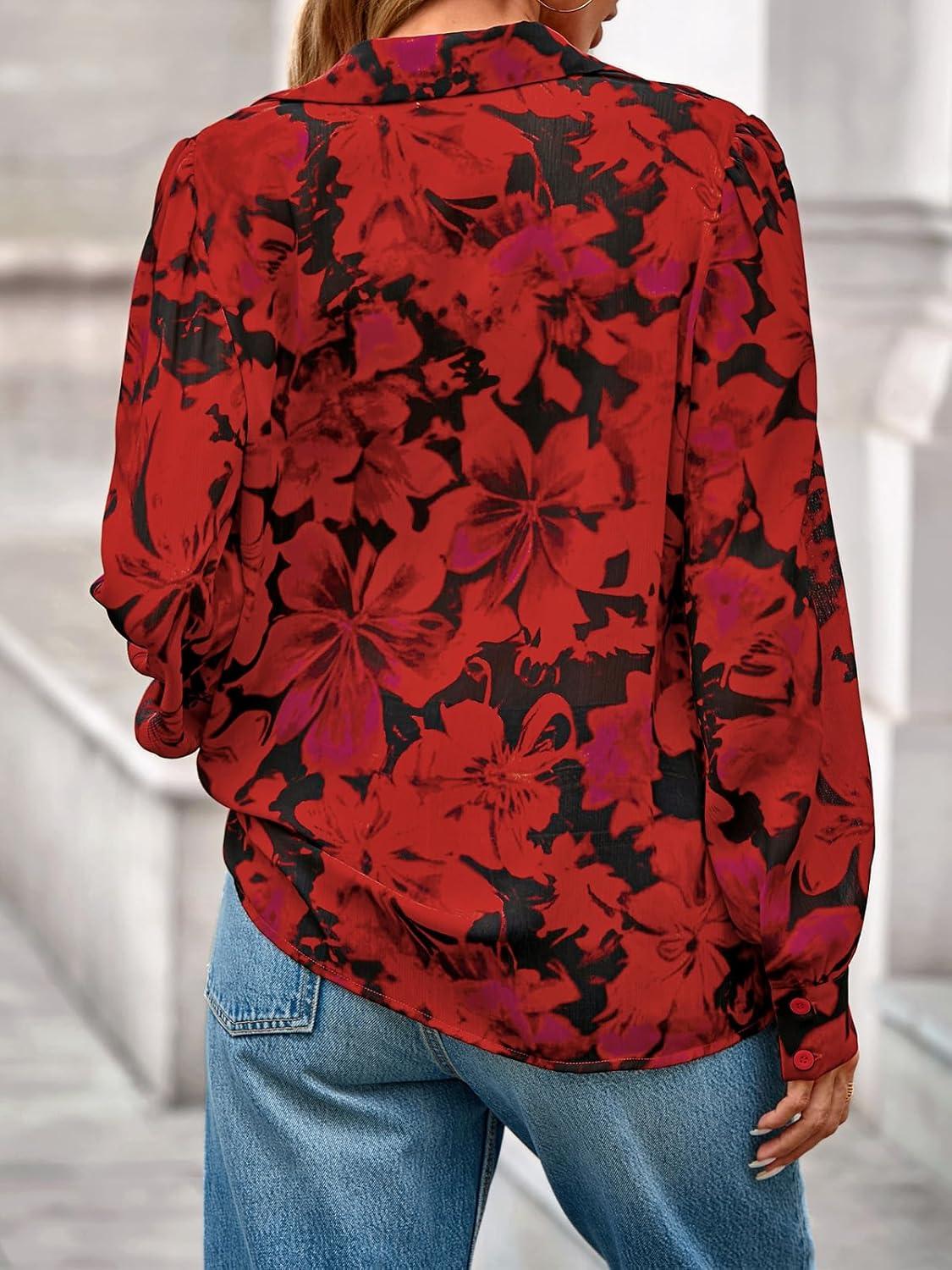 PRETTYGARDEN Women's Floral Blouses Dressy Casual V Neck Button Down Shirts Lantern Long Sleeve Boho Chiffon Fall Tops 2025(Floral Red)