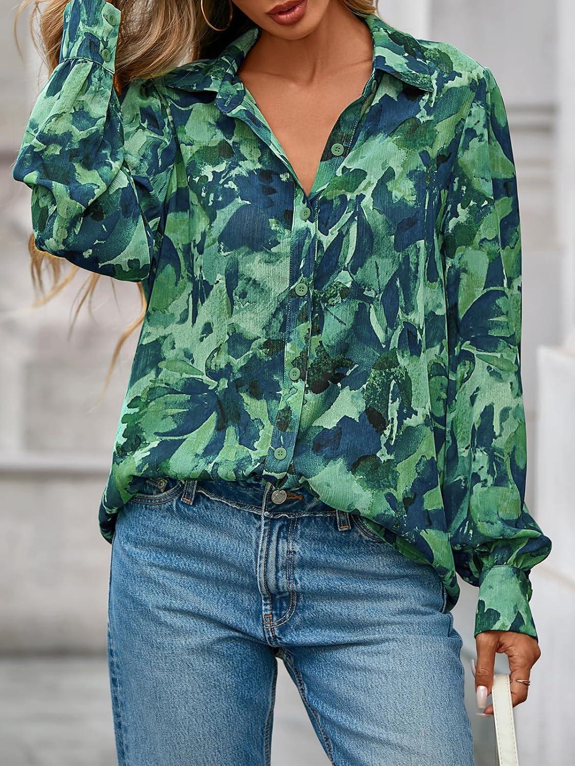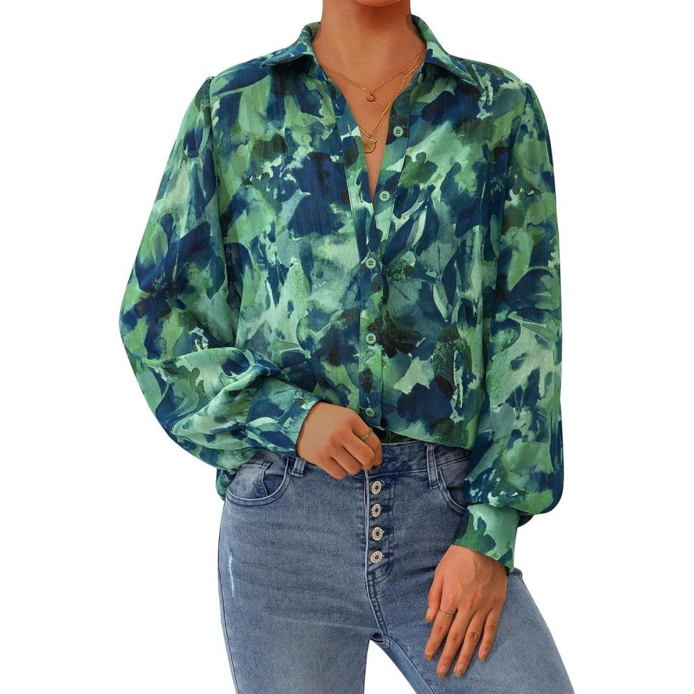 PRETTYGARDEN Women's Floral Blouses Dressy Casual V Neck Button Down Shirts Lantern Long Sleeve Boho Chiffon Fall Tops 2025(Green)