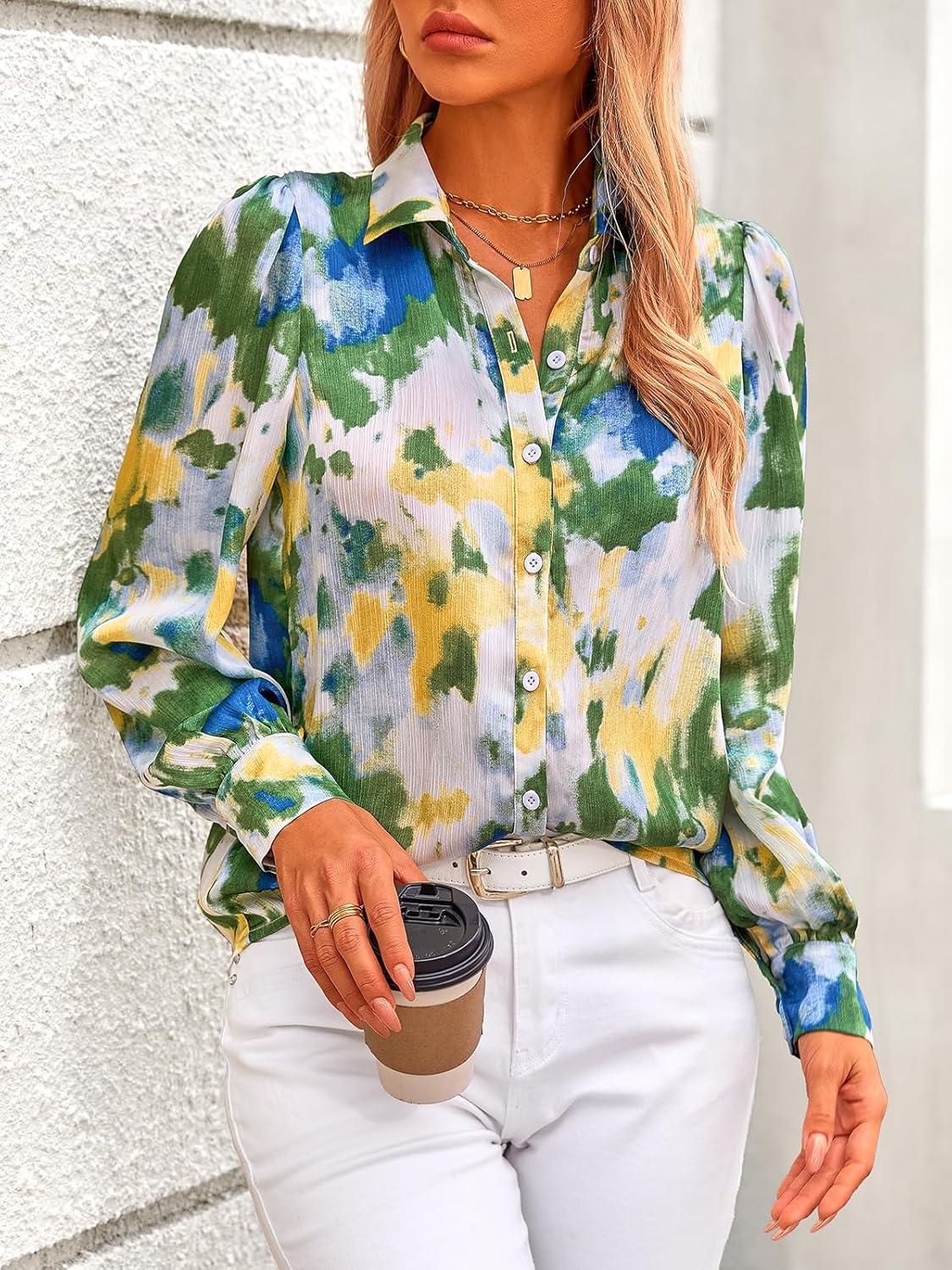PRETTYGARDEN Women’s Floral Blouses Dressy Casual V Neck Button Down Shirts Lantern Long Sleeve Boho Chiffon Fall Tops 2025(Green Floral)