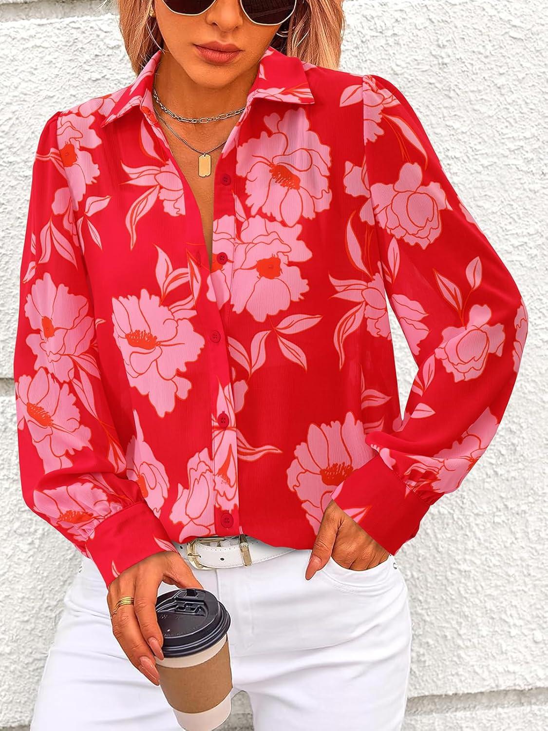 PRETTYGARDEN Women’s Floral Blouses Dressy Casual V Neck Button Down Shirts Lantern Long Sleeve Boho Chiffon Fall Tops 2025(Red)