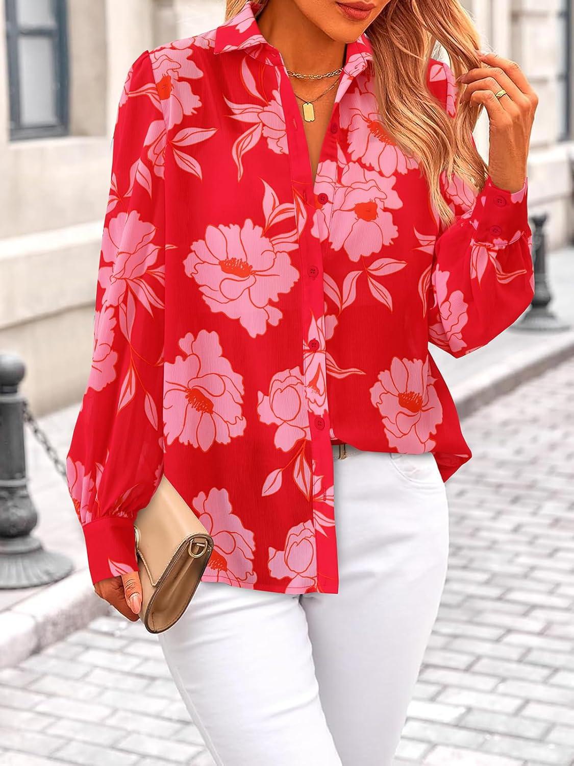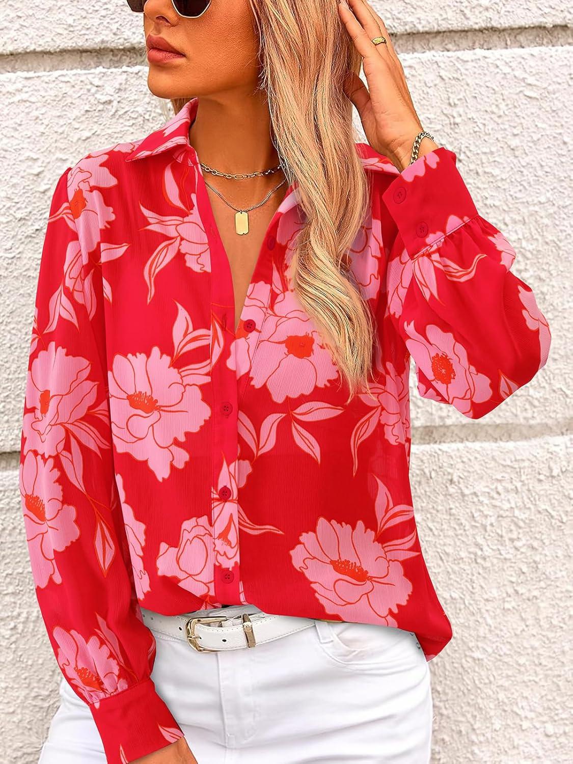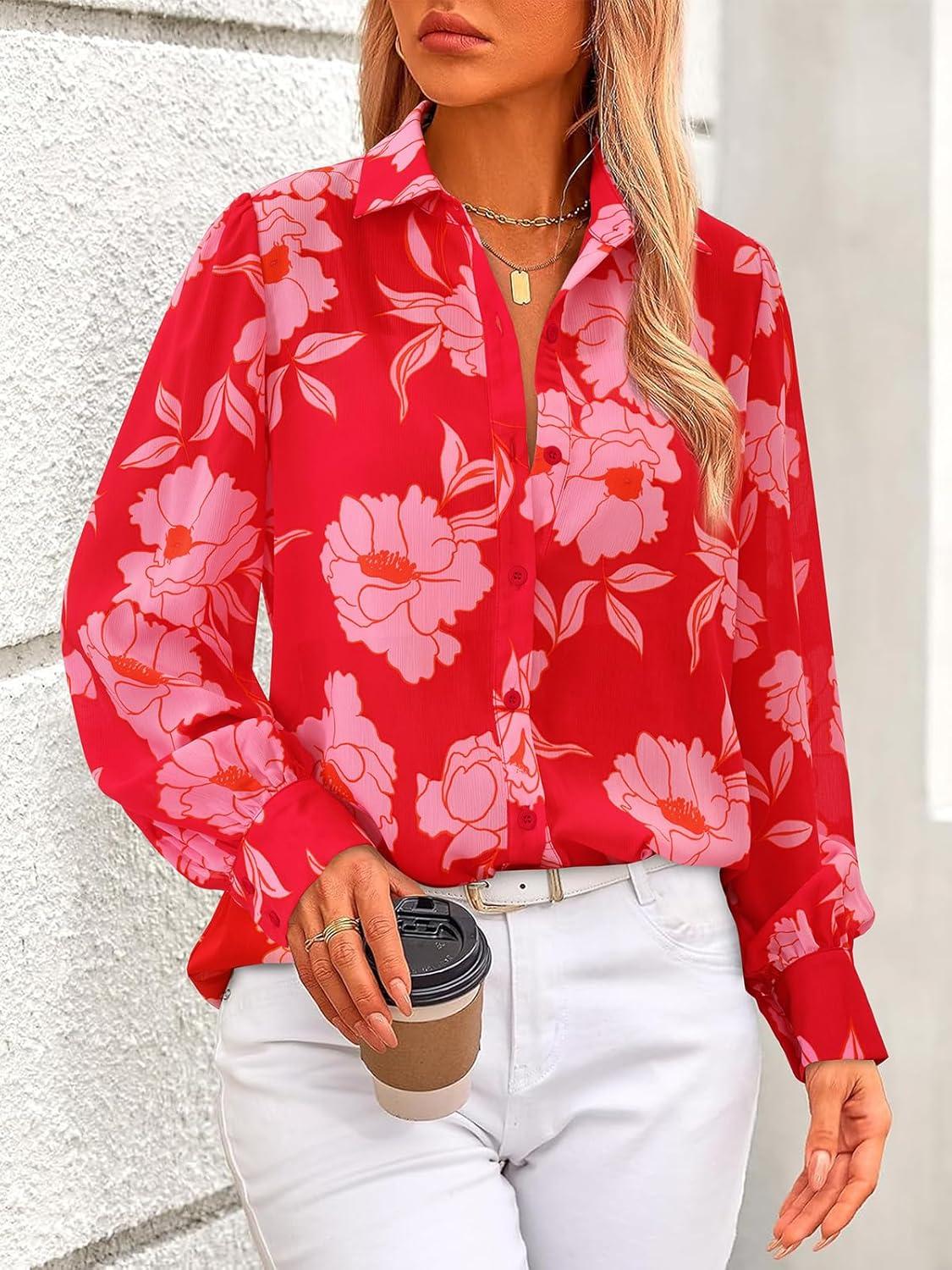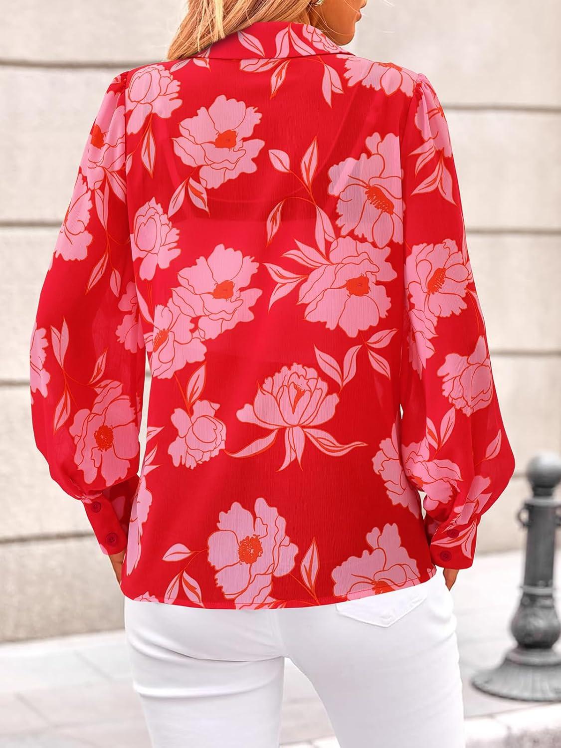 PRETTYGARDEN Women's Floral Blouses Dressy Casual V Neck Button Down Shirts Lantern Long Sleeve Boho Chiffon Fall Tops 2025(Red)