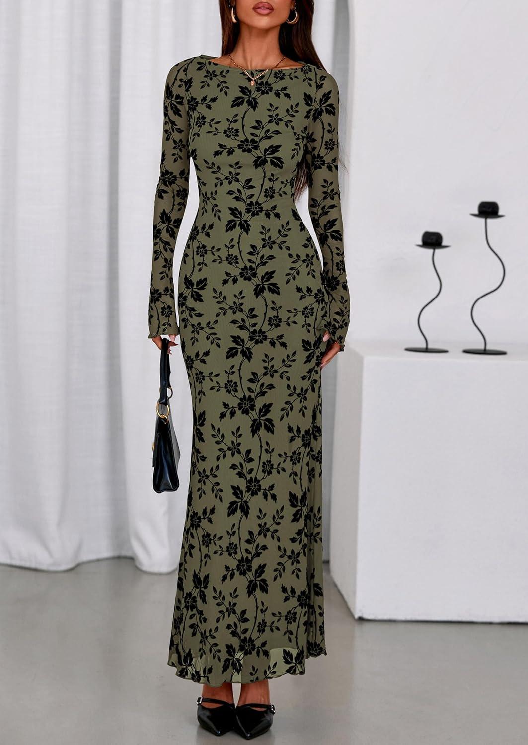 PRETTYGARDEN Women’s Floral Bodycon Maxi Dress 2025 Fall Elegant Mesh Long Sleeve Formal Wedding Guest Cocktail Dresses(Army Green)