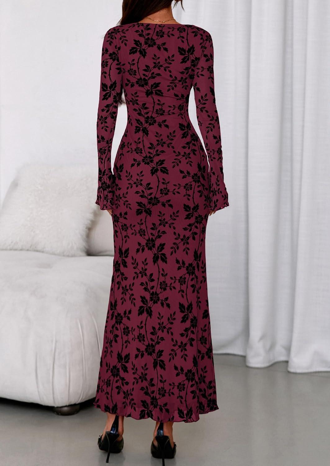 PRETTYGARDEN Women's Floral Bodycon Maxi Dress 2025 Fall Elegant Mesh Long Sleeve Formal Wedding Guest Cocktail Dresses(Burgundy)