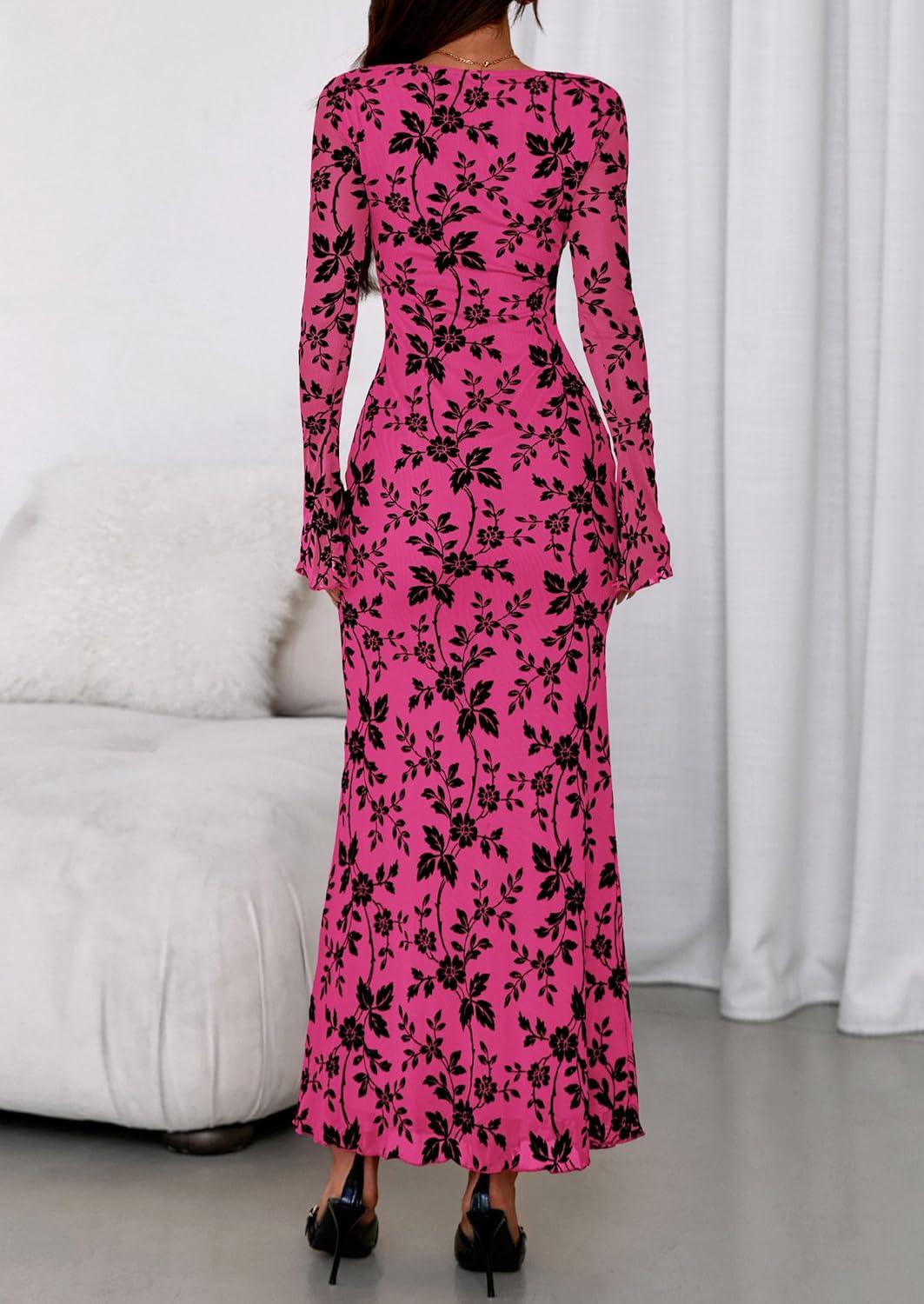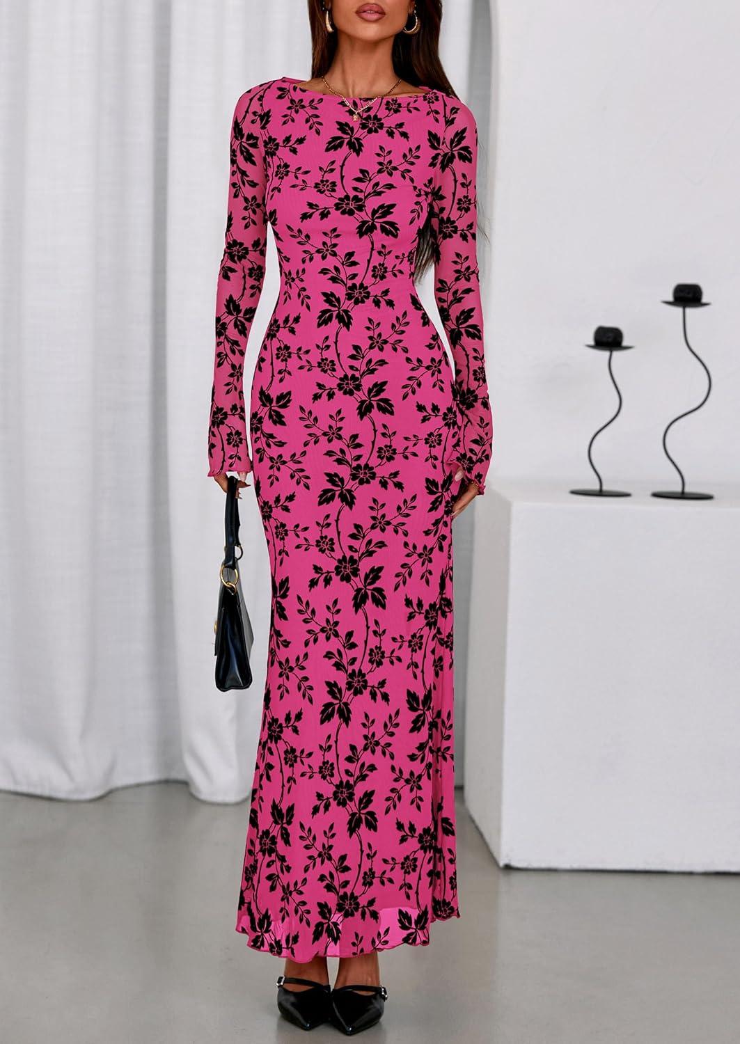 PRETTYGARDEN Women’s Floral Bodycon Maxi Dress 2025 Fall Elegant Mesh Long Sleeve Formal Wedding Guest Cocktail Dresses(Hot Pink)