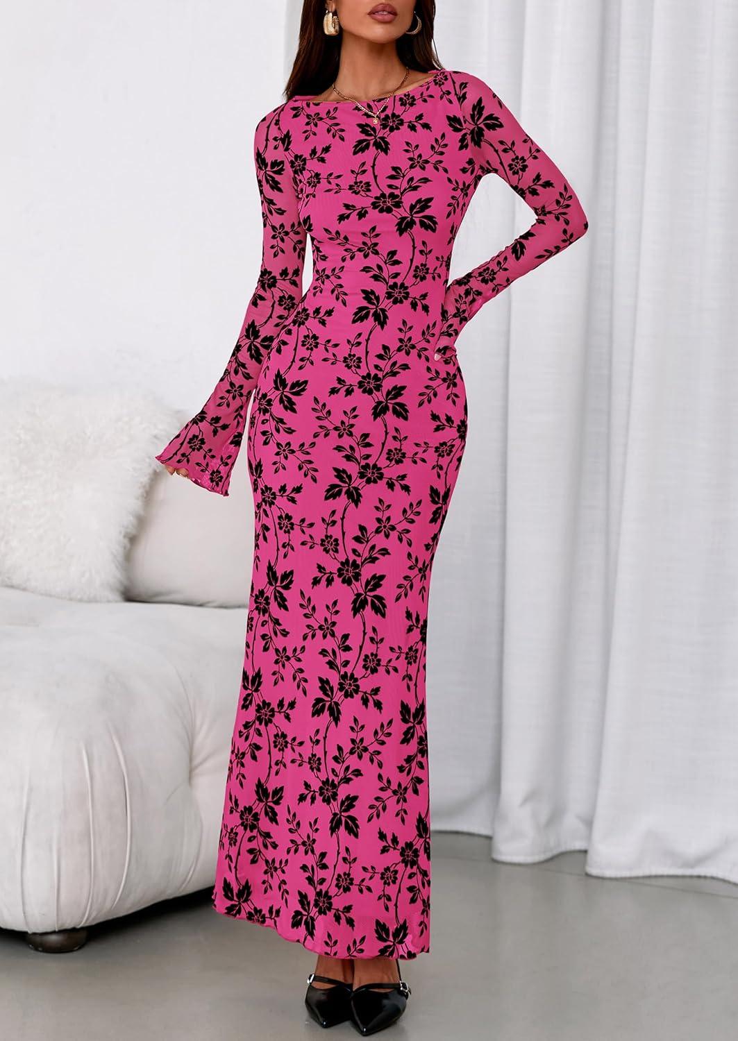 PRETTYGARDEN Women's Floral Bodycon Maxi Dress 2025 Fall Elegant Mesh Long Sleeve Formal Wedding Guest Cocktail Dresses(Hot Pink)