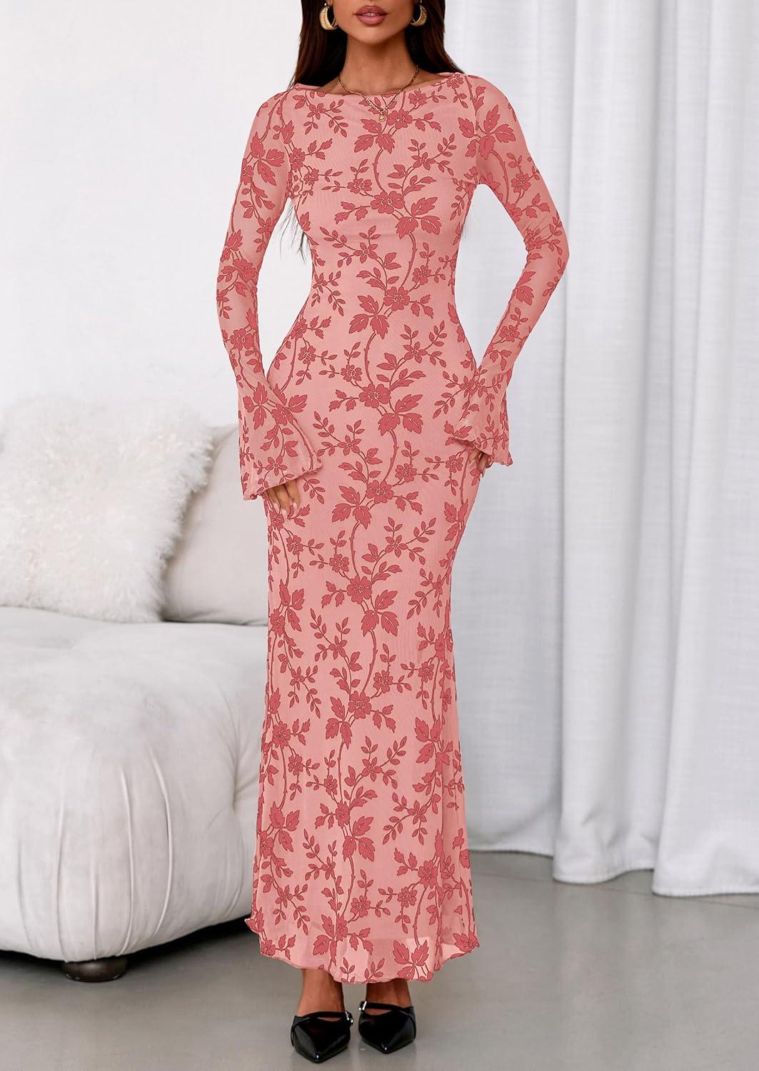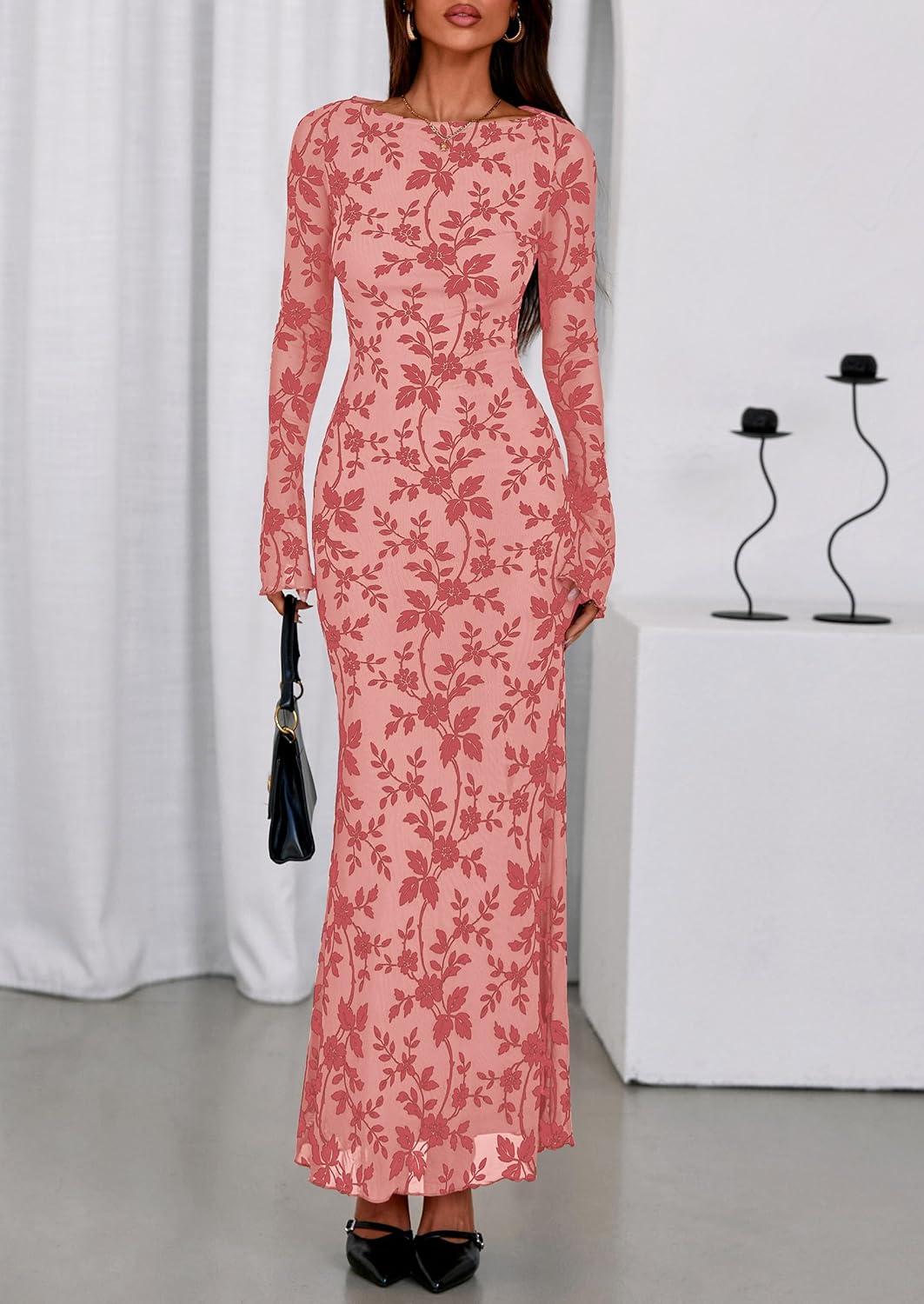 PRETTYGARDEN Women's Floral Bodycon Maxi Dress 2025 Fall Elegant Mesh Long Sleeve Formal Wedding Guest Cocktail Dresses(Pink)