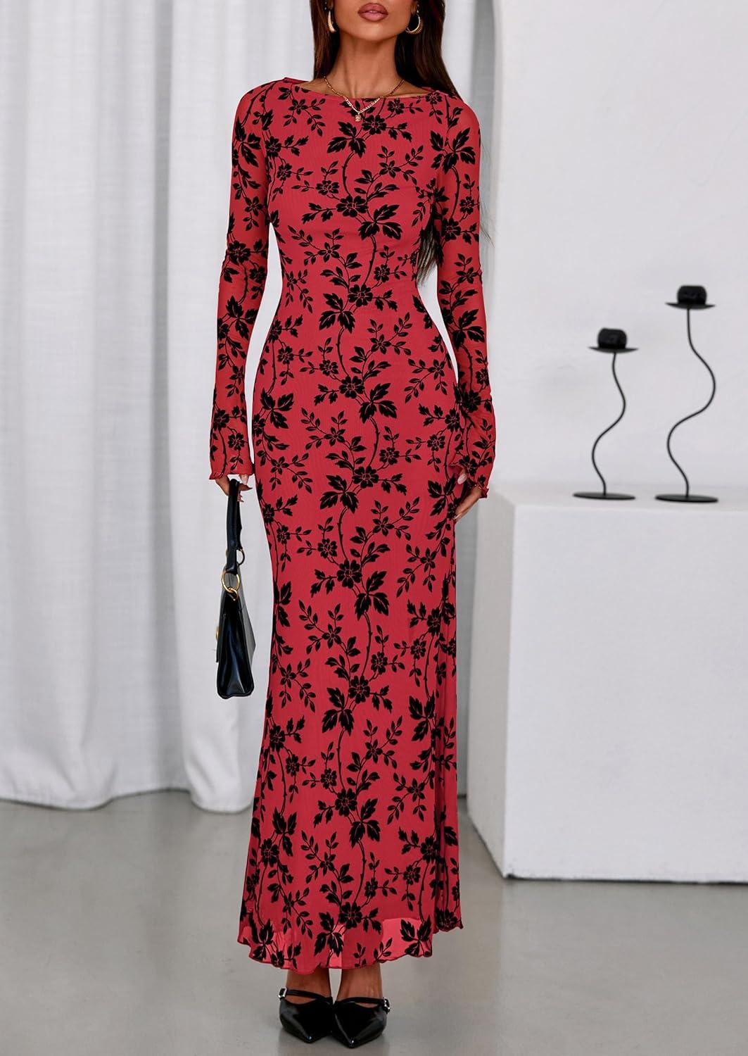 PRETTYGARDEN Women’s Floral Bodycon Maxi Dress 2025 Fall Elegant Mesh Long Sleeve Formal Wedding Guest Cocktail Dresses(Red)