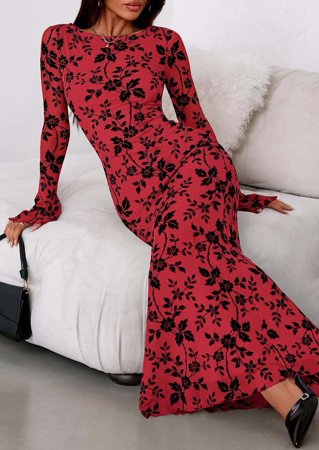 PRETTYGARDEN Women's Floral Bodycon Maxi Dress 2025 Fall Elegant Mesh Long Sleeve Formal Wedding Guest Cocktail Dresses(Red)