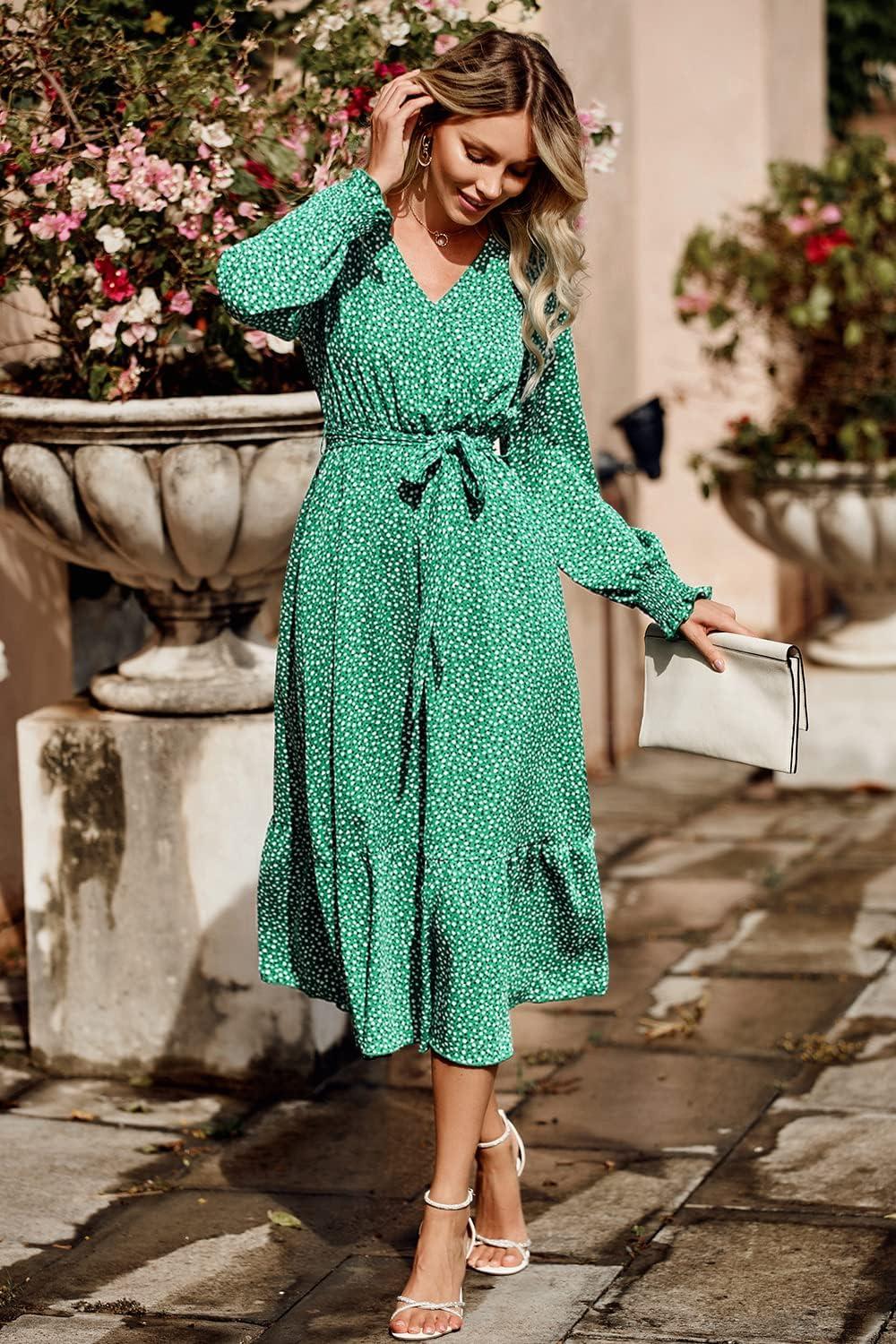 PRETTYGARDEN Women's Floral Boho Dress Fall Long Sleeve Wrap V Neck Ruffle Flowy Maxi Spring Wedding Guest Vacation Dresses(B_green)