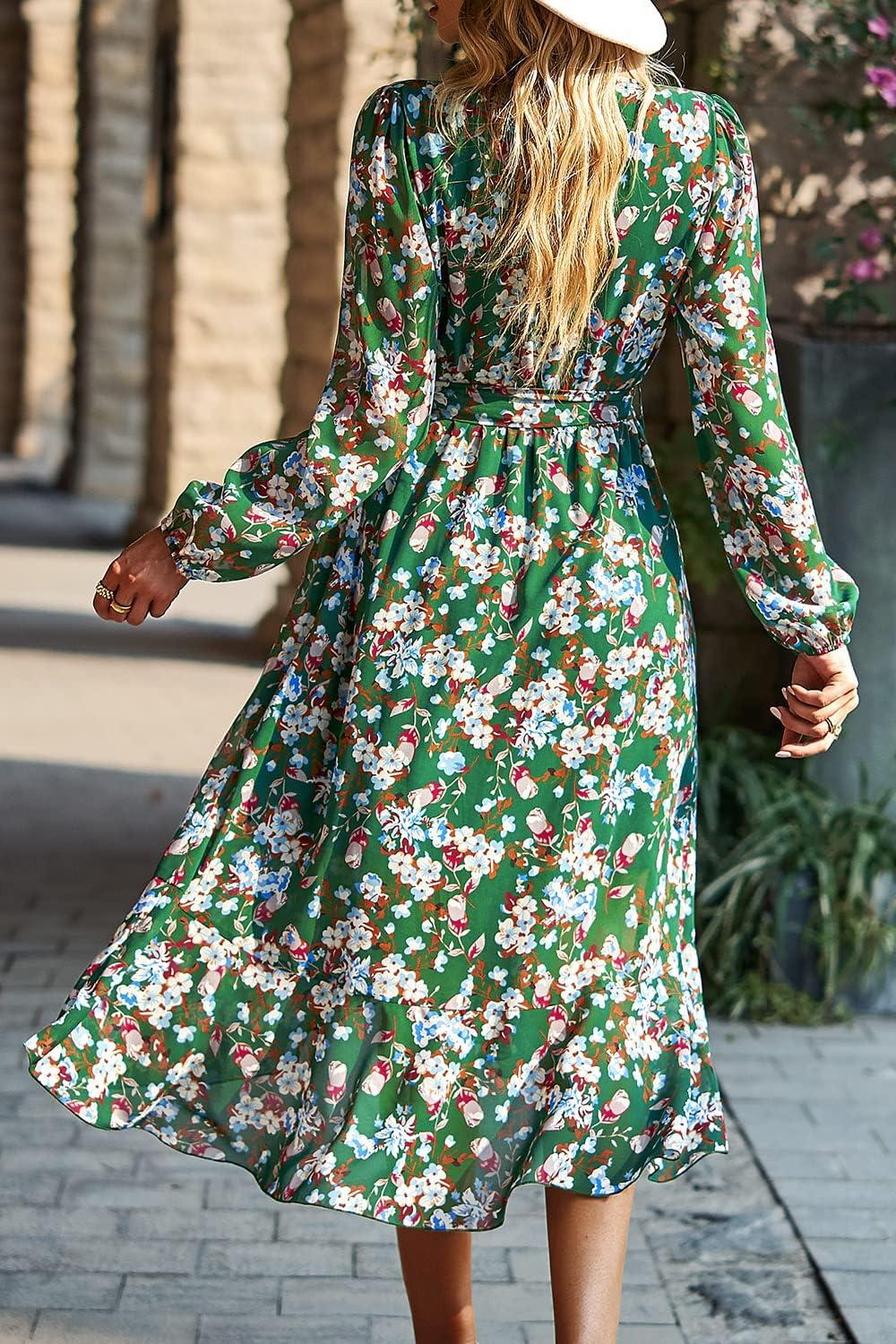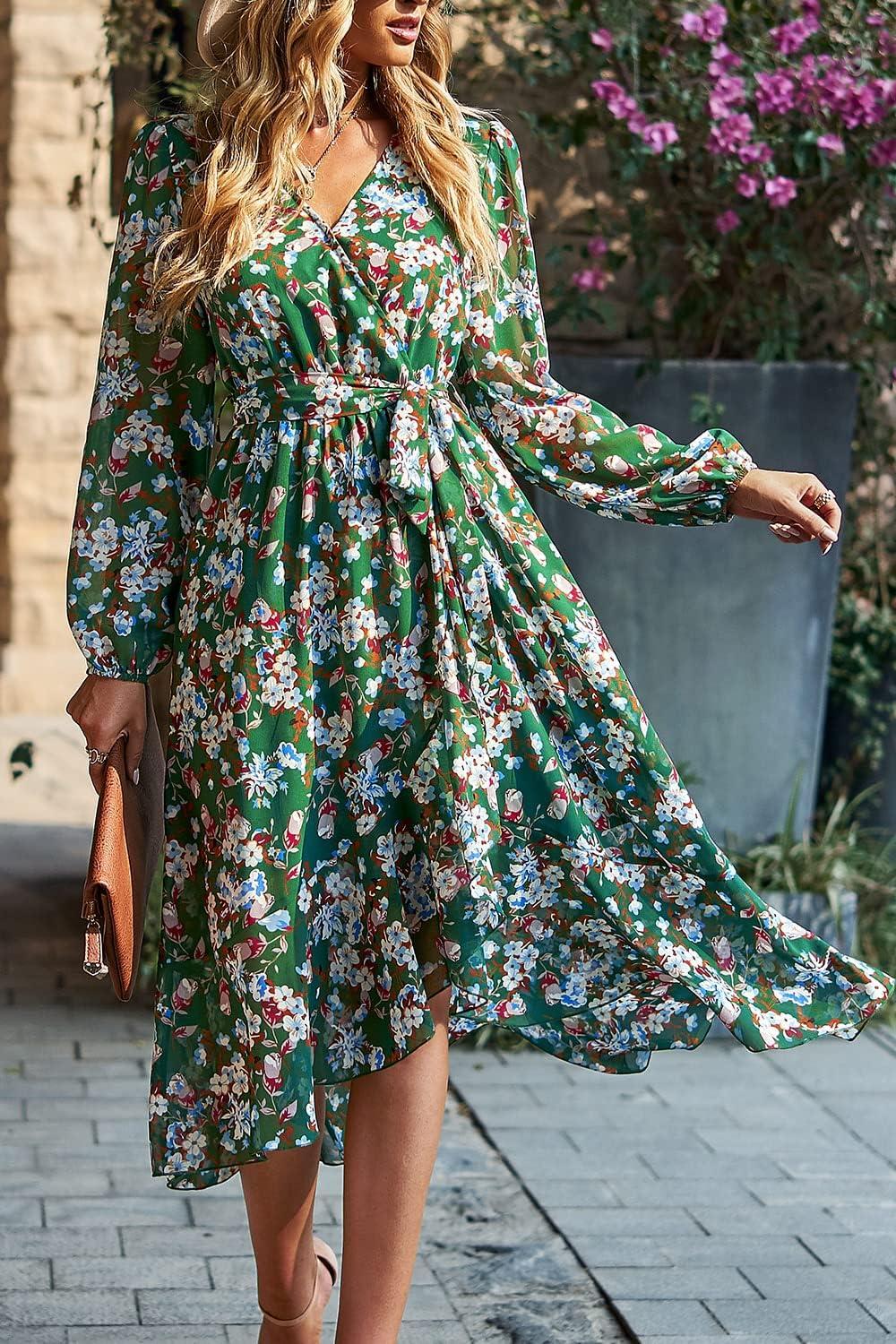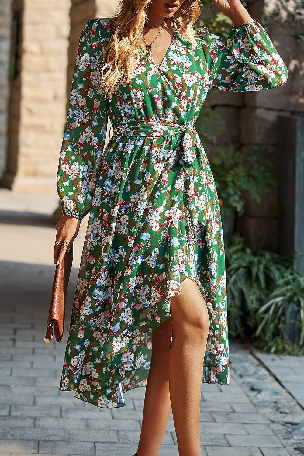 PRETTYGARDEN Women's Floral Boho Dress Fall Long Sleeve Wrap V Neck Ruffle Flowy Maxi Spring Wedding Guest Vacation Dresses(Floral Green)