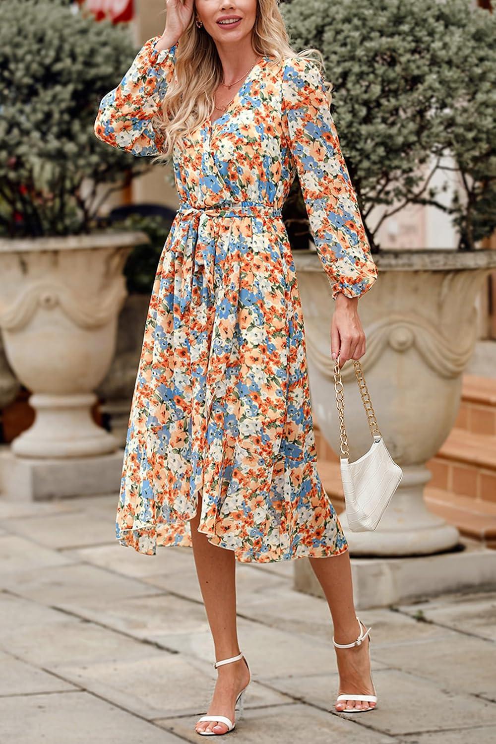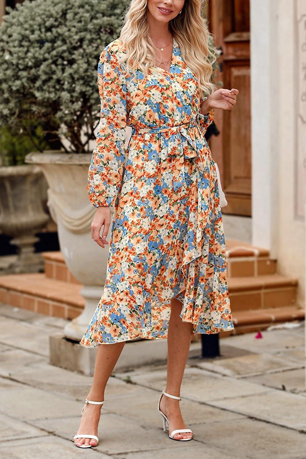 PRETTYGARDEN Women's Floral Boho Dress Fall Long Sleeve Wrap V Neck Ruffle Flowy Maxi Spring Wedding Guest Vacation Dresses(Floral Yellow)